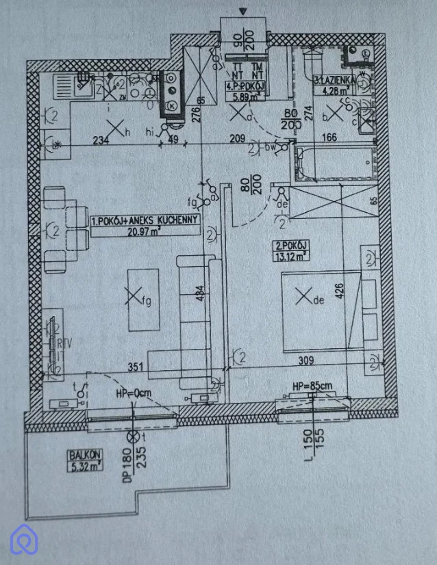- Pokój dzienny z aneksem kuchennym: 20,97 m²