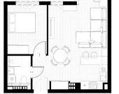 Mieszkanie charakteryzuje się ergonomicznym układem, oferując kompaktowy i funkcjonalny aneks kuchenny oraz przestronny salon.