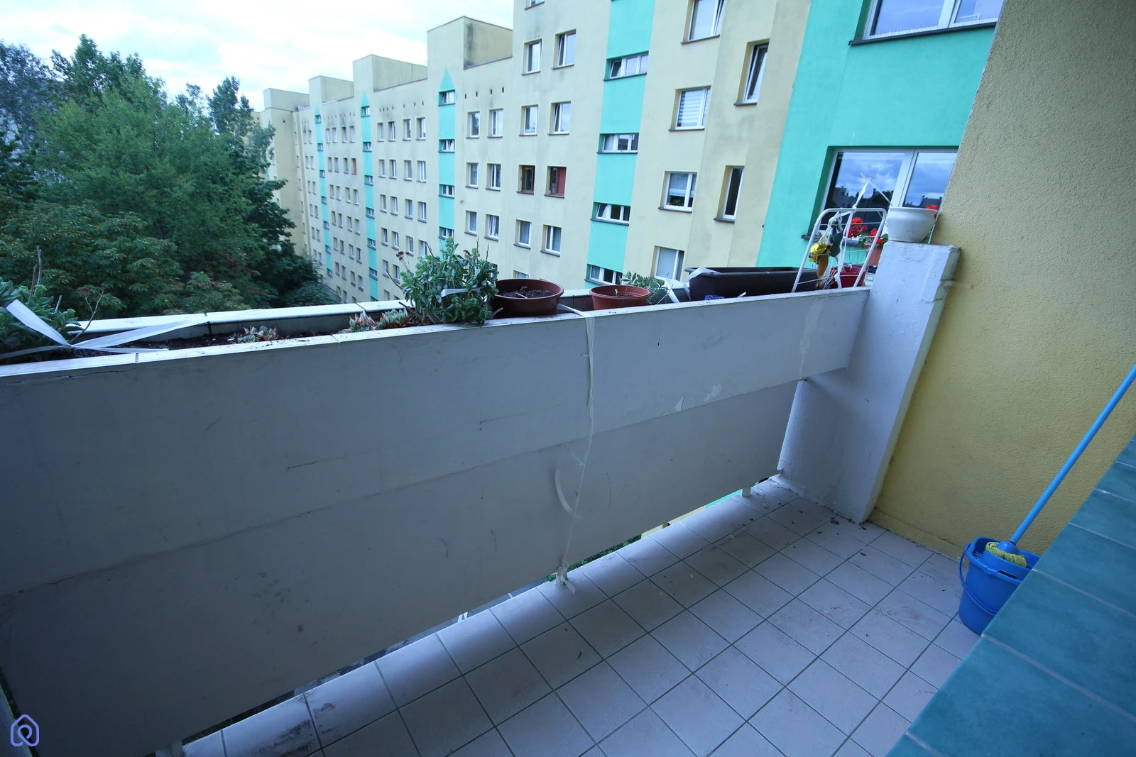 Dwa pokoje, kuchnia, łazienka, przedpokój, balkon i piwnica.