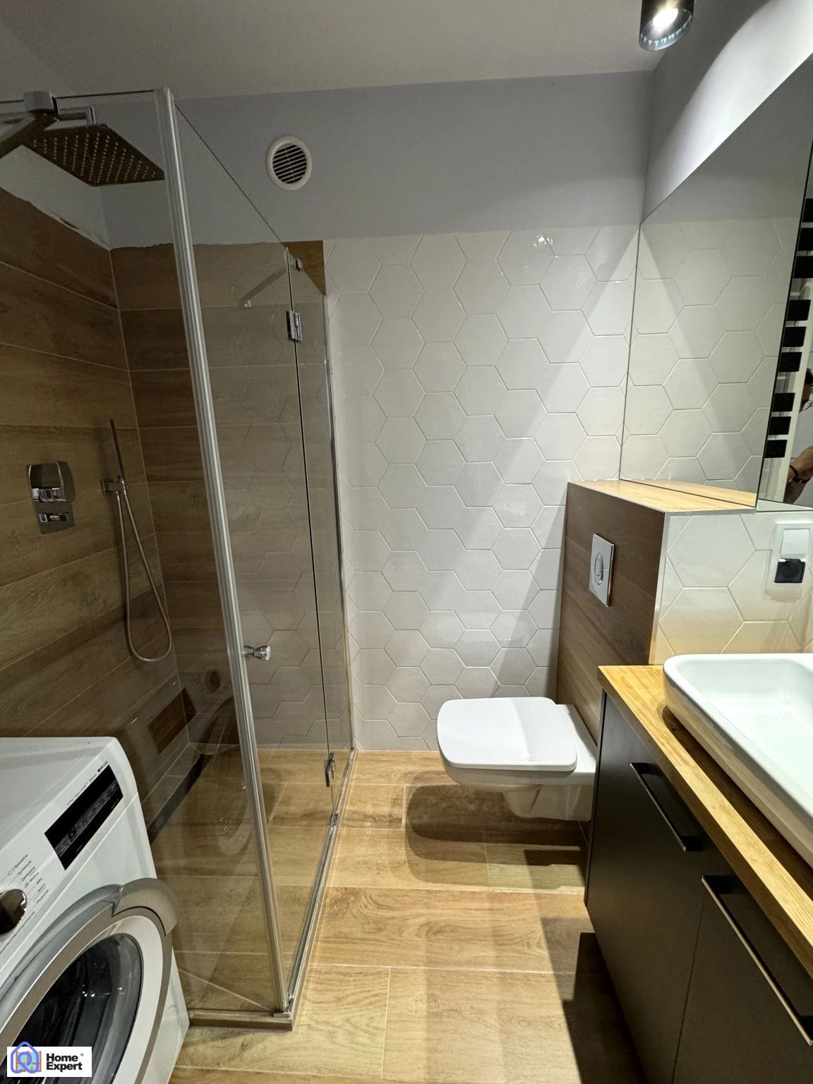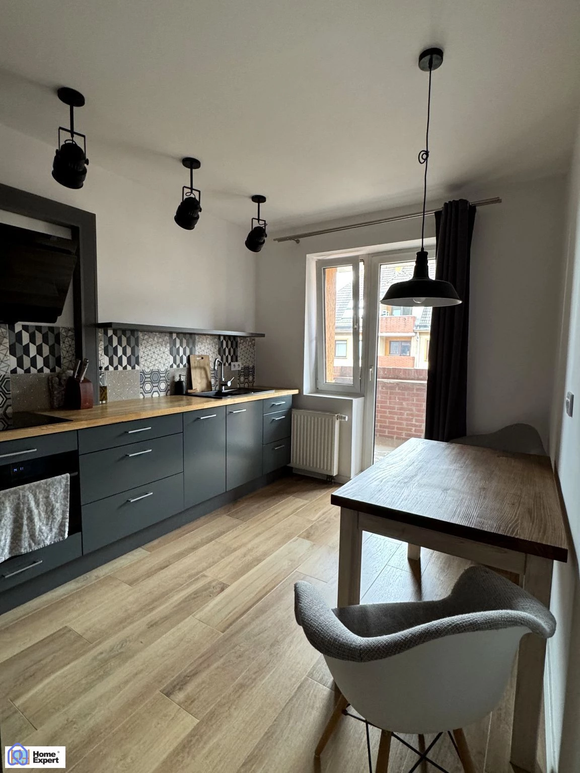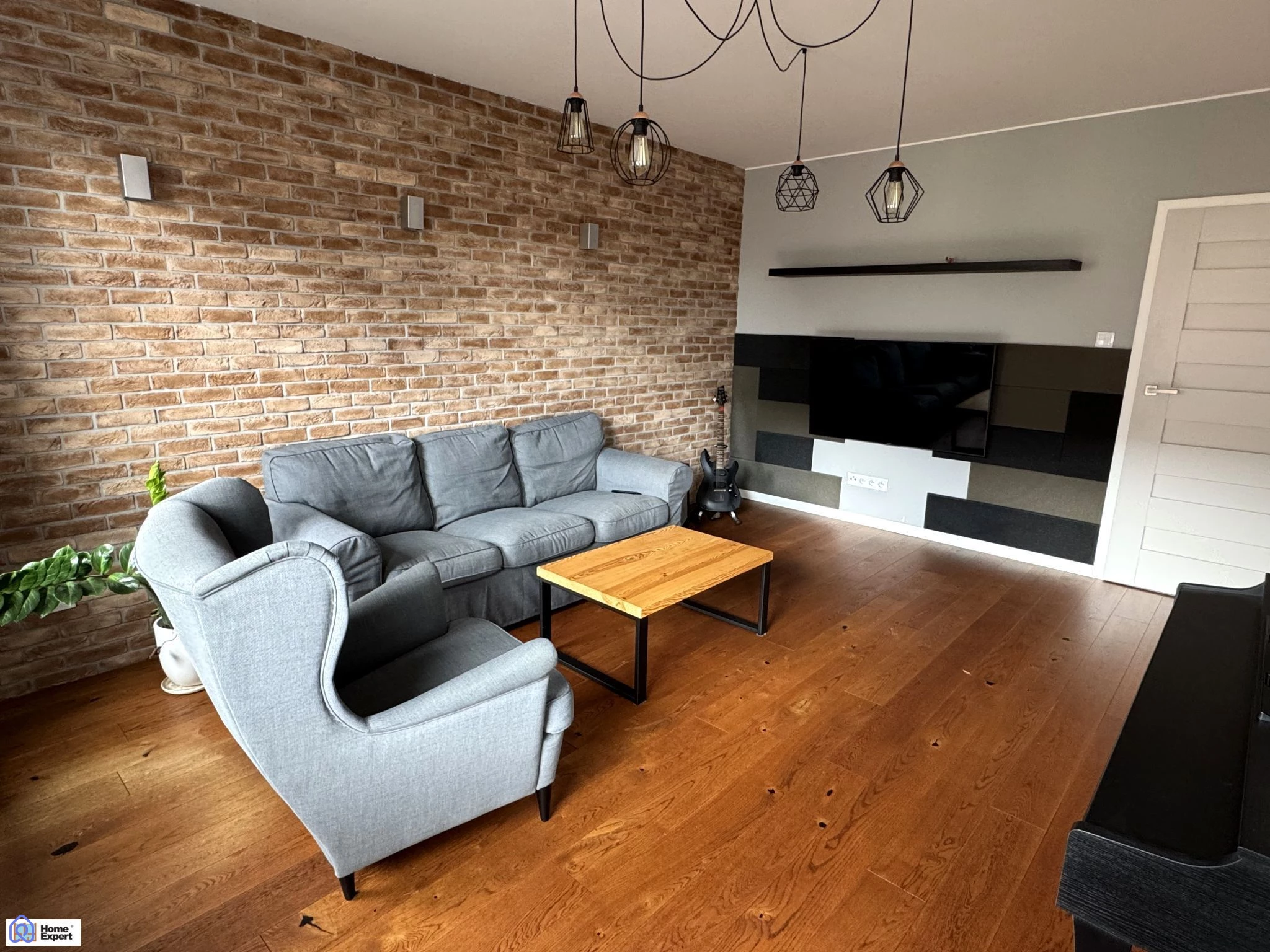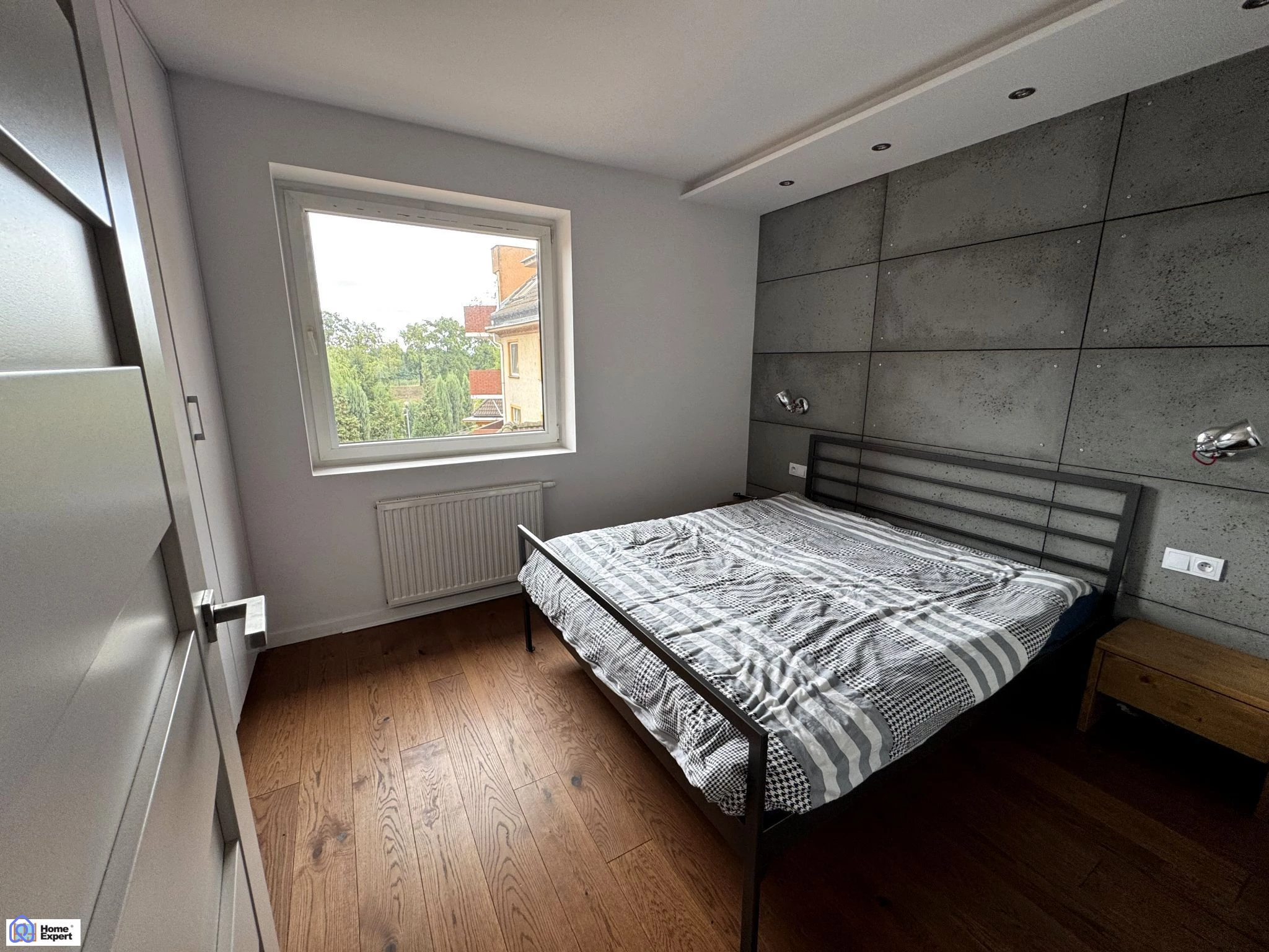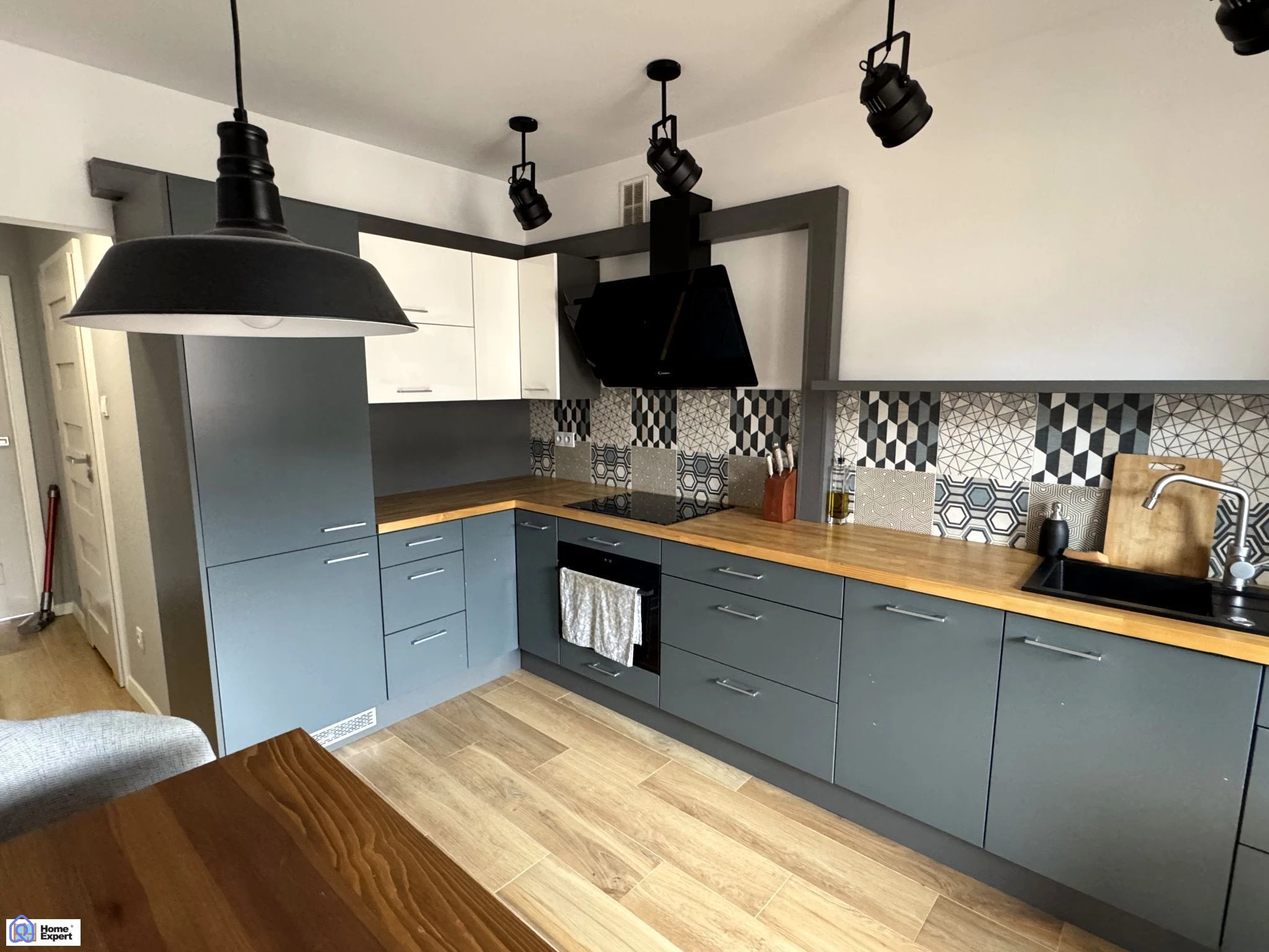 Wysoki standard wykończenia: drewniana podłoga, nowoczesne meble i wysokiej jakości sprzęt AGD (lodówka, piekarnik z mikrofalą, zmywarka, płyta indukcyjna).