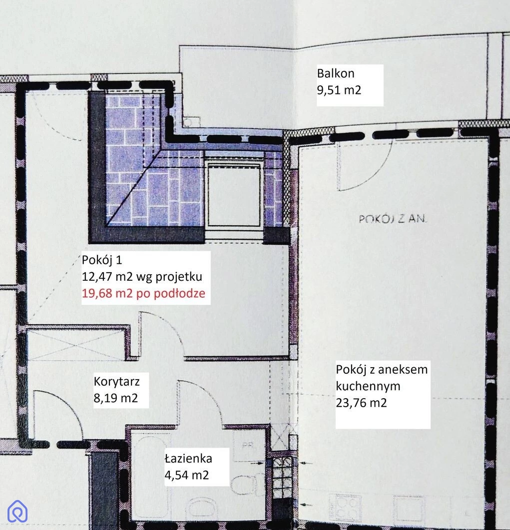 Sypialnia: 12,47 m² (ok. 19,68 m² po podłodze)
