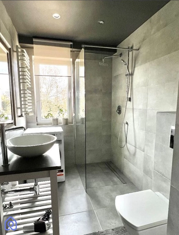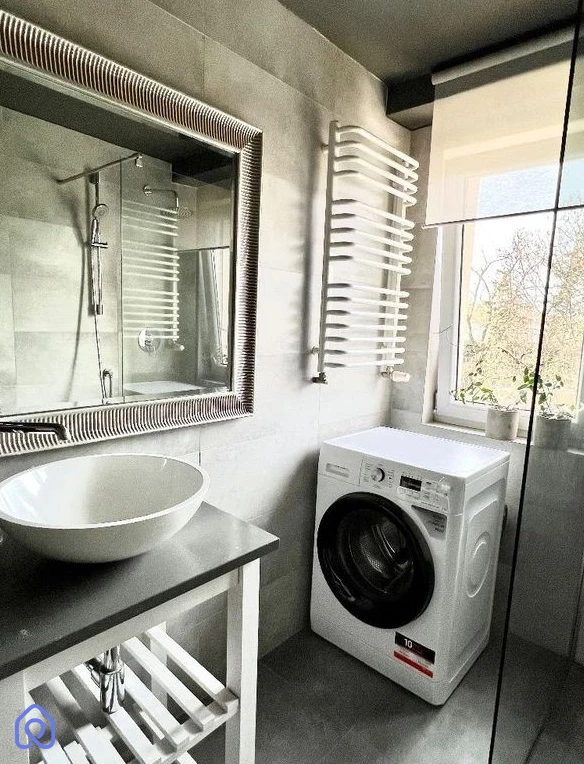 Łazienkę z oknem, prysznicem z deszczownicą, szybą z odpływem liniowym, toaletą, umywalką nablatową i pralką.