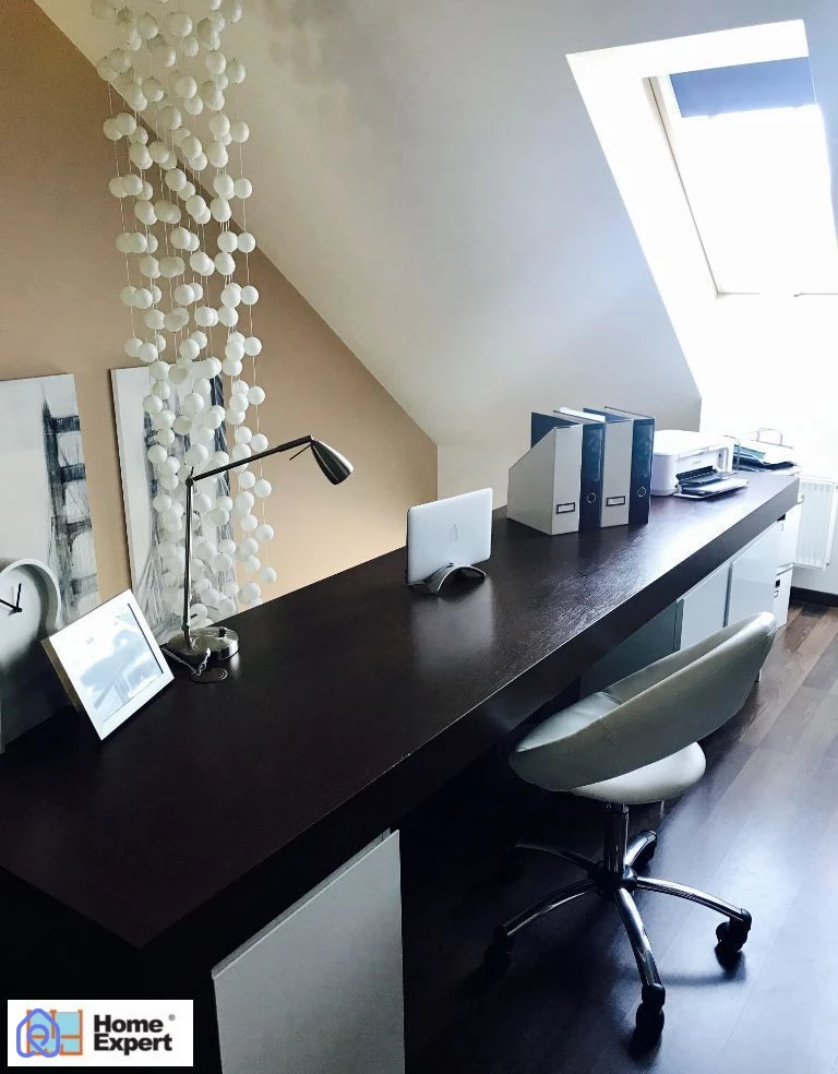 Na drugim poziomie wielka szafa wnękowa oraz łoże małżeńskie, miejsce do pracy - długie biurko z wygodnym krzesłem i dziennym światłem wpadającym przez dwa okna połaciowe.