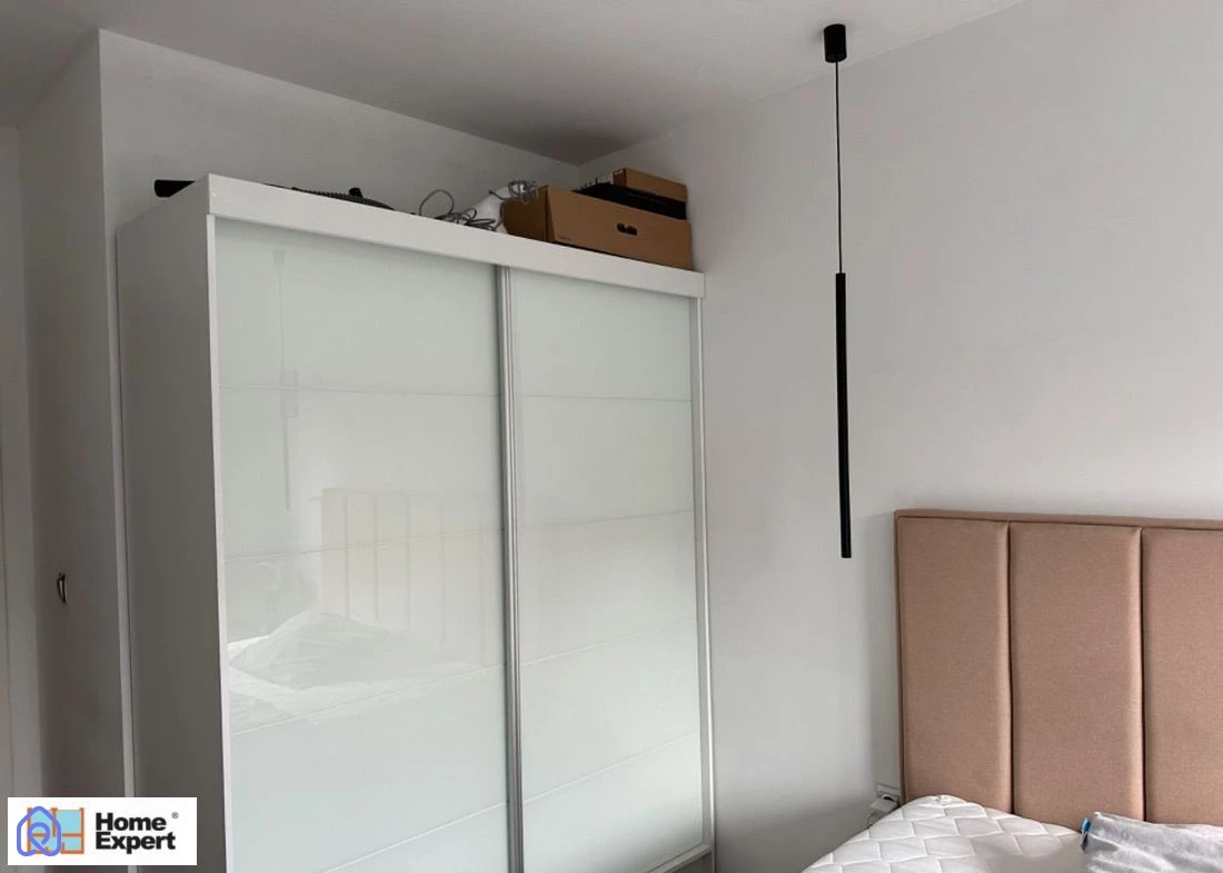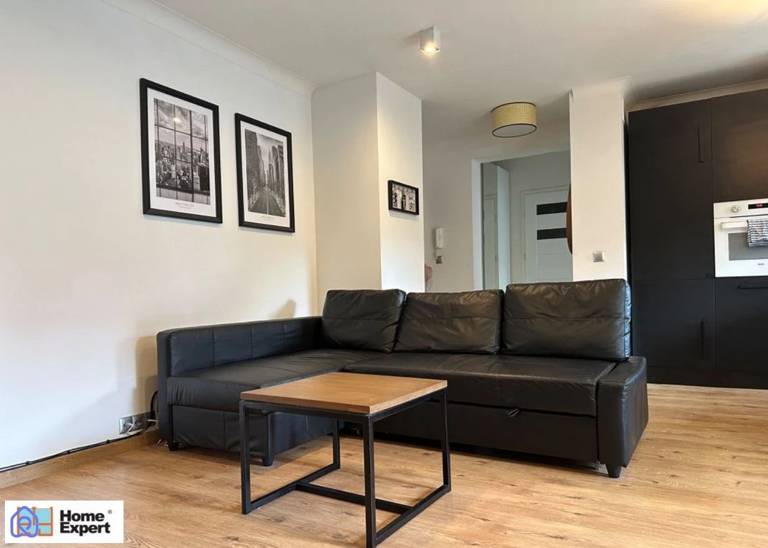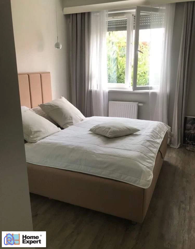 Składa się z salonu połączonego z aneksem kuchennym, wyposażonym w meble i sprzęt AGD (kuchenka, zabudowana lodówka, pralka) oraz sypialni z dużym łóżkiem i szafą.