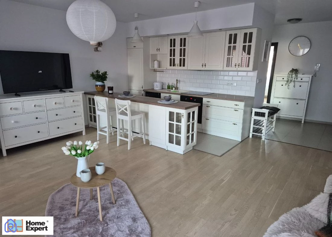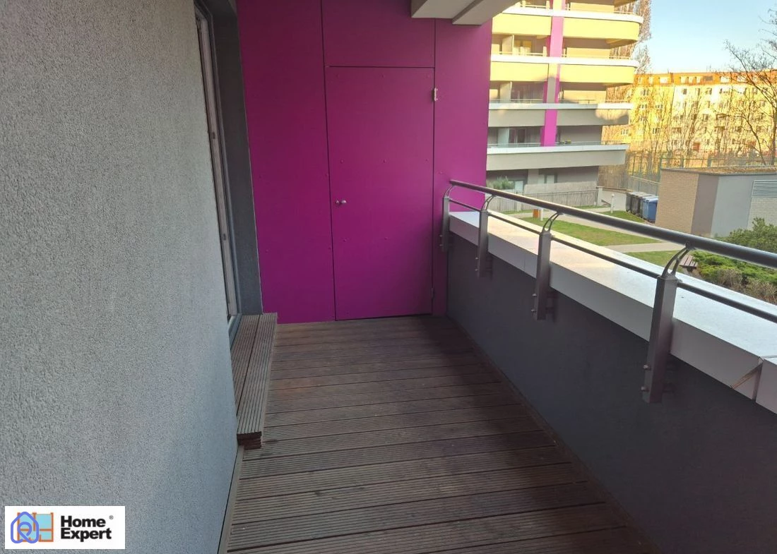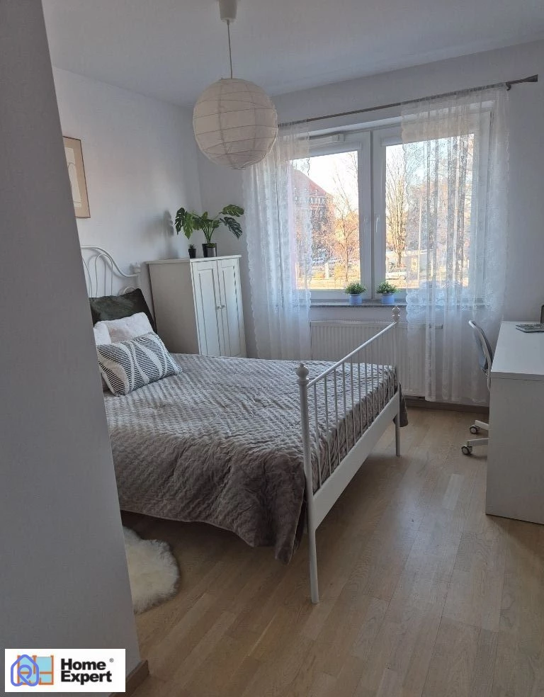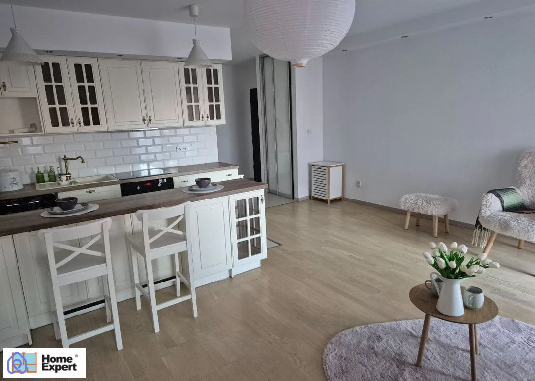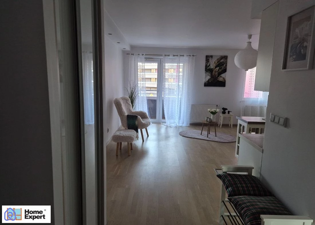 W pełni umeblowane mieszkanie składa się z salonu z aneksem kuchennym, sypialni, łazienki oraz balkonu z widokiem na teren zamknięty osiedla (podwórko).