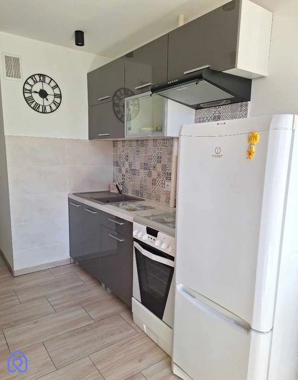 Oddzielna kuchnia, umeblowana i wyposażona w sprzęt AGD (lodówka, kuchenka, okap).