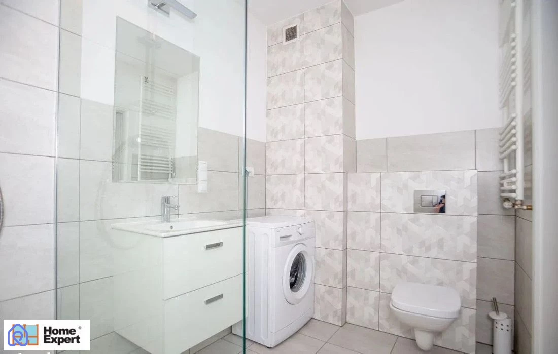 Łazienka: kabina prysznicowa, toaleta, pralka, umywalka, lustro, szafki łazienkowe