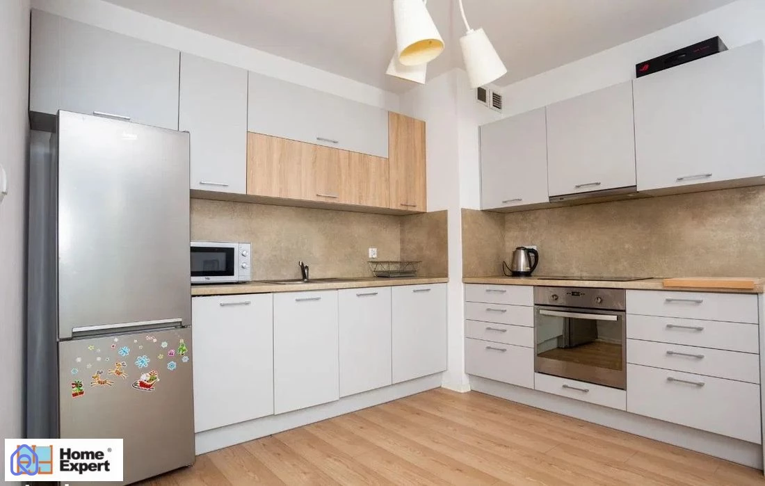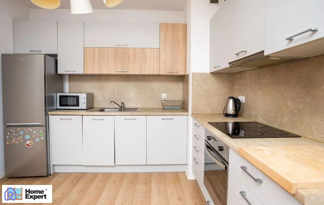 Kuchnia: meble kuchenne, zmywarka, lodówka, piekarnik, okap, mikrofalówka, stół z krzesłami