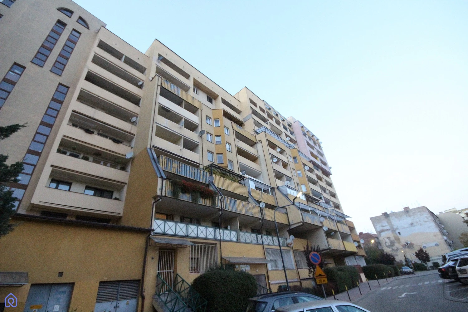 Wspólnota mieszkaniowa posiada duży przyległy teren zabezpieczony szlabanami, na którym można parkować samochody. W otoczeniu budynku znajdują się trawniki oraz nasadzenia krzewów, co tworzy miły krajobraz.