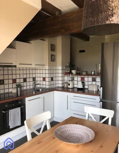 * kuchnia - meble na wymiar ze sprzętami (płyta grzewcza, piekarnik, okap, zmywarka, lodówka z zamrażarką, czajnik), stół z krzesłami.