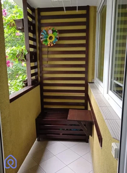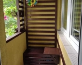 - Balkon typu loggia, zabudowany funkcjonalnymi meblami ławką ze skrzynią, którą można wykorzystać do gromadzenia różnych rzeczy oraz zamykanym stolikiem.