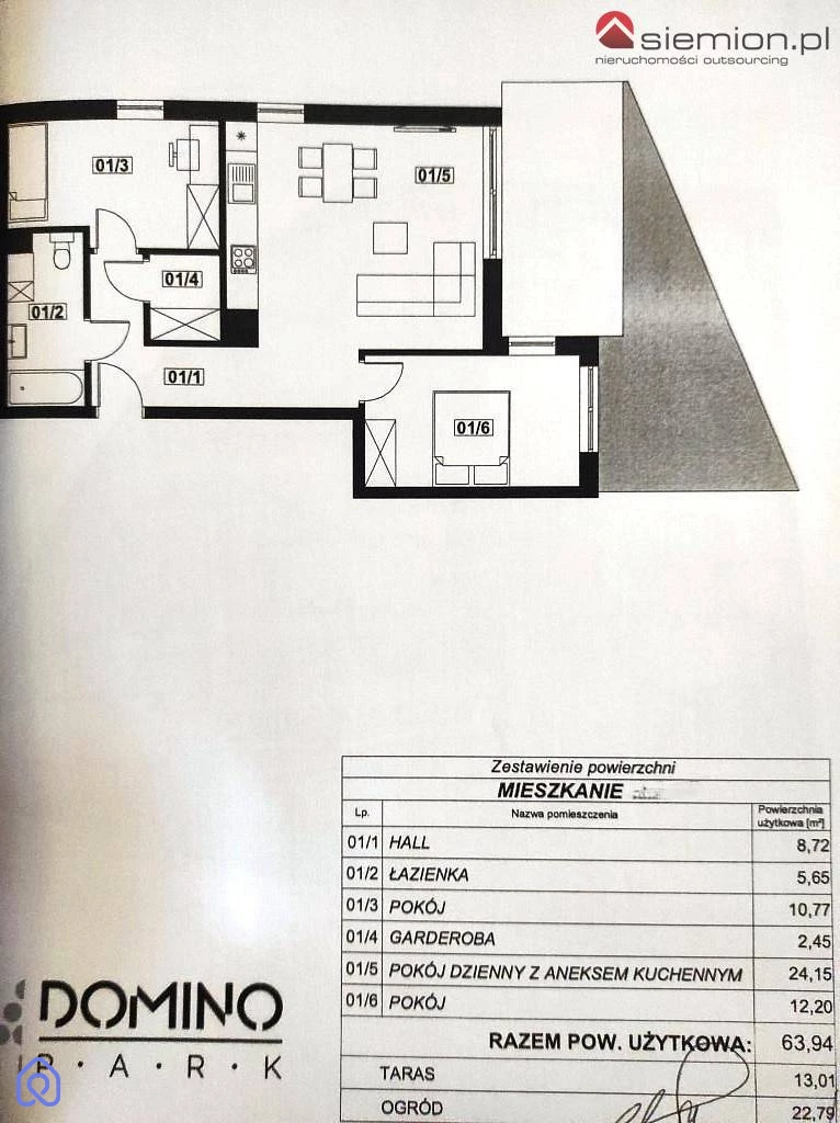 OKAZJA!!! APARTAMENT Z OGRÓDKIEM !!! Polecamy do sprzedaży atrakcyjny apartament o powierzchni 63,94 m2 położony na wysokim parterze w 3-piętrowym nowoczesnym budynku z 2022 roku Domino Park w Siemianowicach Śląskich - Michałkowicach, składający się z przestronnego salonu z którego jest wyjście na taras połączonego z aneksem kuchennym, dwóch pokoi (z jednego wyjście do ogrodu), łazienki z WC, przedpokoju oraz garderoby. Apartament posiada ogród o powierzchni 35,80 m2 oraz dodatkowo płatne 30 000zł dwa miejsca postojowe naziemne przy budynku. Budynek ocieplony, z zamontowanym domofonem, wyposażony w windę, usytuowany na zamkniętym osiedlu. Mieszkanie w stanie deweloperskim do wykończenia według własnych potrzeb. Okna plastikowe trój-szybowe z zamontowanymi roletami antywłamaniowymi skierowane na wschód i południe, Ogrzewanie (podłogowe) i ciepła woda z sieci (własna kotłownia na osiedlu). Miesięczny czynsz z zaliczką na C.O., zimną i ciepłą wodę, fundusz remontowy, eksploatację (również miejsca postojowego),wynosi ok. 700 zł. Spokojna okolica z dostępem do licznych punktów usługowych i handlowych. W pobliżu również szkoła, przedszkole, przystanki komunikacji miejskiej. Bardzo dobry dojazd do miast ościennych m.in. Chorzowa, Katowic, Czeladzi, Piekar Śląskich czy Bytomia. Zapraszamy do kontaktu z naszym Pośrednikiem. Zadzwoń i umów się na spotkanie! Bezpłatnie pomagamy w załatwieniu kredytu. Treść niniejszego ogłoszenia nie stanowi oferty handlowej w rozumieniu Kodeksu Cywilnego. Treść ma charakter informacyjny i została przygotowana na podstawie informacji uzyskanych od właściciela nieruchomości, W przypadku zainteresowania ofertą dokonamy pełnej weryfikacji. Kontaktując się z biurem Klient wyraża zgodę na przetwarzanie danych osobowych zgodnie z przepisami ustawy z dnia 29 sierpnia 1997 roku o ochronie danych osobowych / Dz.U.Nr. 133 poz. 883/. Klientowi przysługuje prawo do wglądu do swoich danych osobowych i ich aktualizacji. Administratorem danych jest Siemion.pl sp. z o.o. z siedzibą w Siemianowicach Śląskich.
