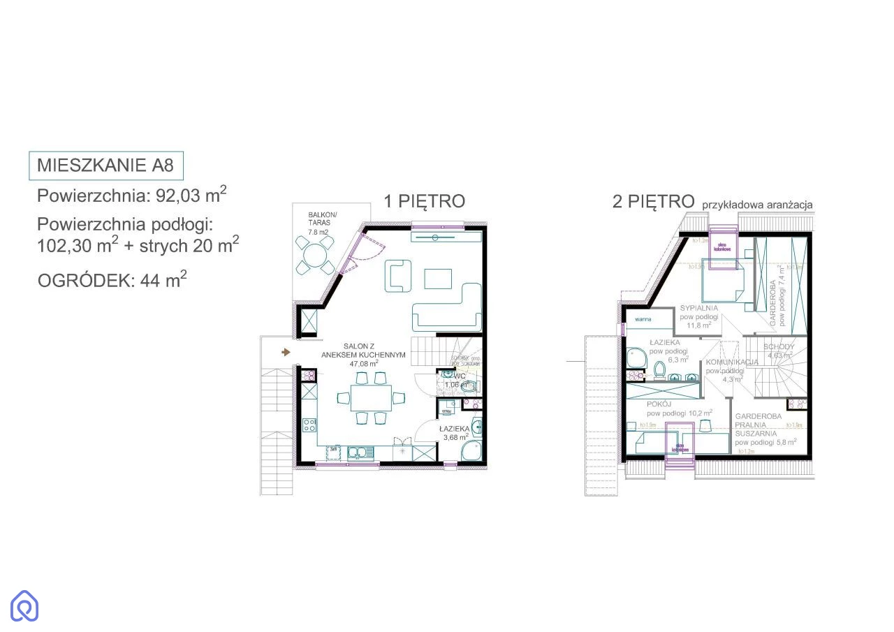 Powierzchnia użytkowa: 92,03 m², Powierzchnia po podłodze: 102,30 m2 + strych 20m2