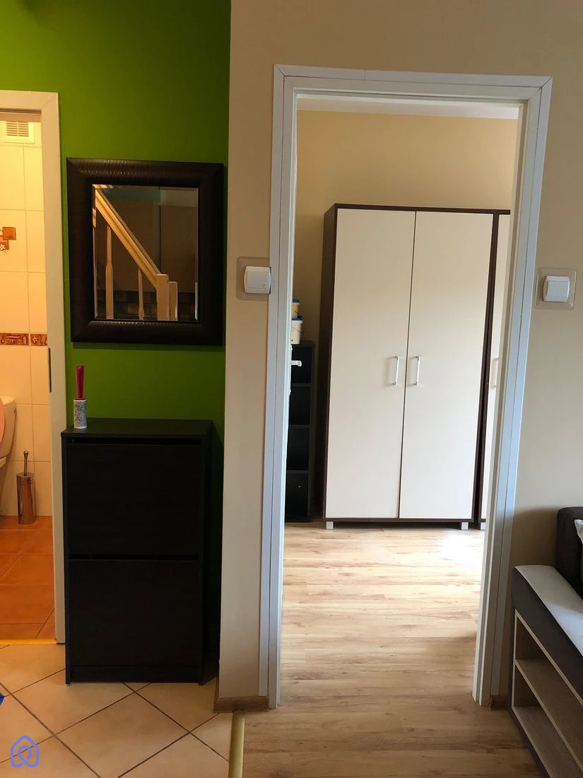 Na dolnym poziomie: salon z aneksem kuchennym (lodówka, kuchenka elektryczna z piekarnikiem, okap), mały pokój z wyjściem na balkon (idealny jako garderoba lub pokój dziecięcy), łazienka z wanną i pralką.