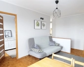 Mieszkanie jest zadbane, doskonale doświetlone, a jego okna skierowane są ponad drzewami lub innymi budynkami. Posiada okna PCV, na podłogach znajduje się mozaika parkietowa, a instalacja elektryczna została wymieniona kilka lat wcześniej. Łazienka wyposażona jest w kabinę prysznicową, a kuchnia zawiera meble oraz dużą lodówkę. Układ pomieszczeń odpowiada przedstawionym na zdjęciu.