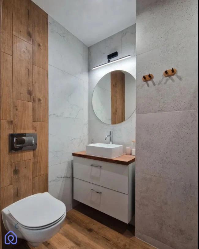 Na podłodze znajdują się panele i gres, ściany są wykończone gładzią i ozdobną tapetą.