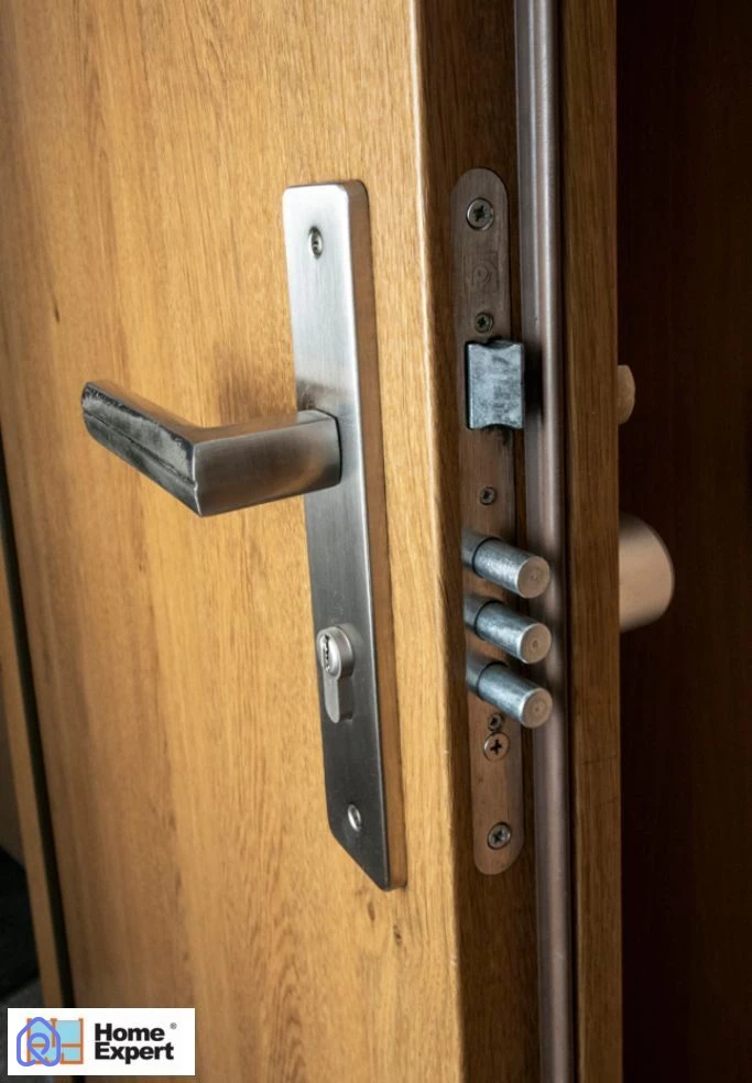 Drzwi wejściowe stalowe, przeciwwyważeniowe, solidne zamki, jeden sterowany elektronicznie, także przez komórkę (Gerda Tedee), rozpoznający mieszkańców przy zbliżaniu się do drzwi.