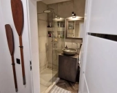 Łazienka jest łącznie z WC i ma wielkość około 4 m2. Szeroki i wygodny prysznic typu Walk-in z deszczownicą renomowanej firmy Kludi pozwala na swobodną kąpiel.