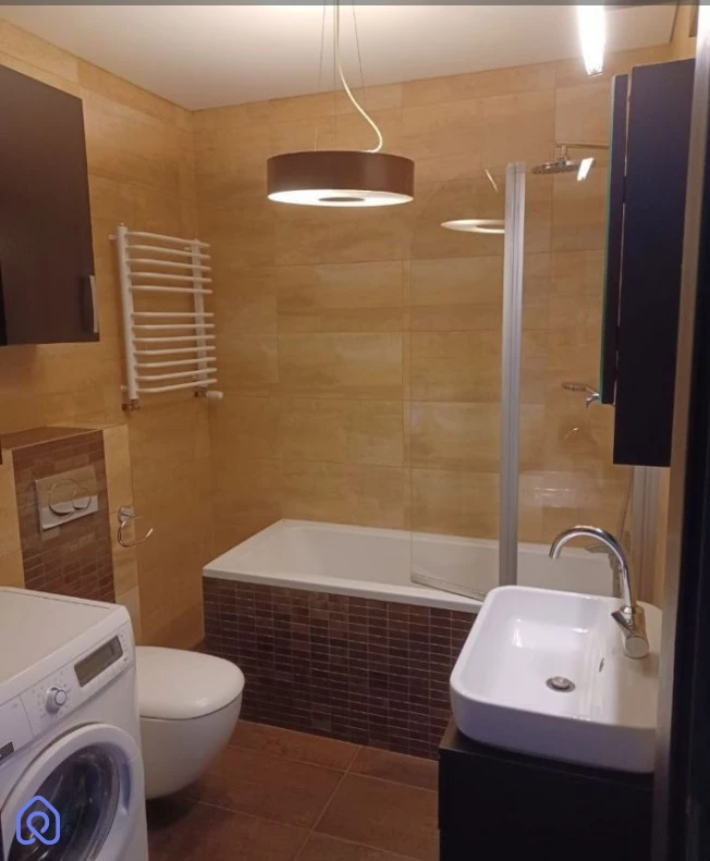 Mieszkanie jest w pełni wykończone! Podłogi pokryte są albo deską Barlinecką albo gresem hiszpańskim. Duże, do samej podłogi bardzo szczelne plastikowe okna w salonie oraz sypialniach wyposażone w wewnętrzne rolety ‘dzień/noc’. Łazienka jest w pełni umeblowana i wyposażona w pralkę, wannę, częściową kabinę prysznicową z prysznicem, umywalkę oraz grzejnik. W salonie znajduje się duży stół jadalniany w komplecie z 4 krzesłami oraz regał na książki z przeszkloną witryną. Aneks kuchenny w pełni umeblowany oraz wyposażony w AGD znanych marek: kuchenka gazowa, piekarnik, mikrofalówka, duża lodówka, zmywarka oraz zlew z baterią z wylewką.