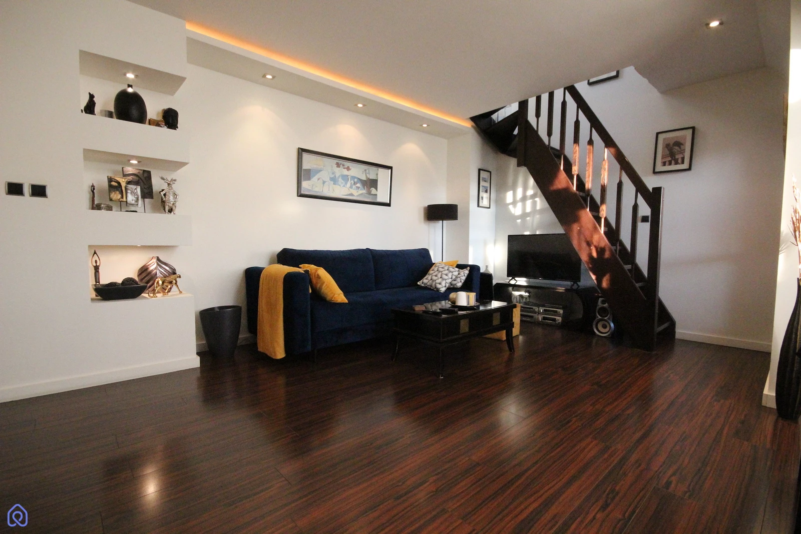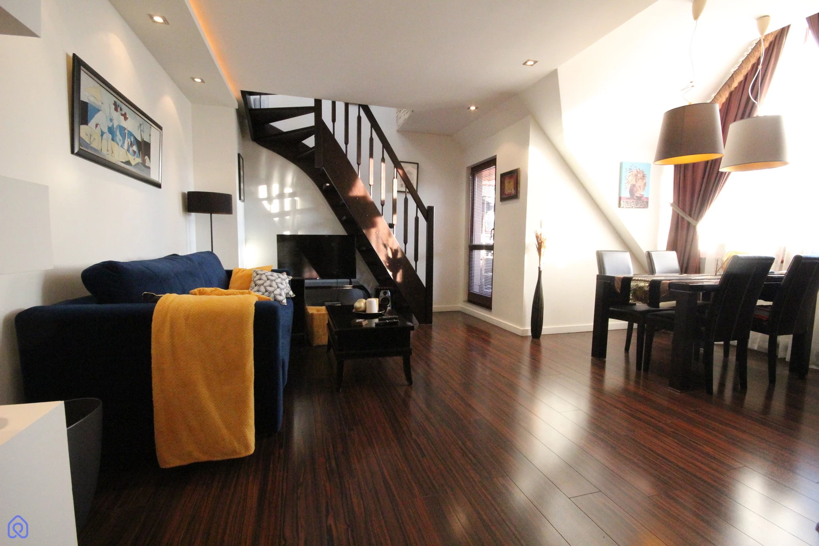 Wyposażenie mieszkania pozostaje w cenie Na pierwszym poziomie jest salon z aneksem kuchennym, łazienka z kabiną prysznicową oraz duża sypialnia.
