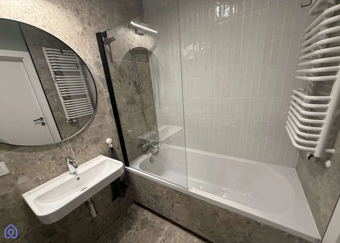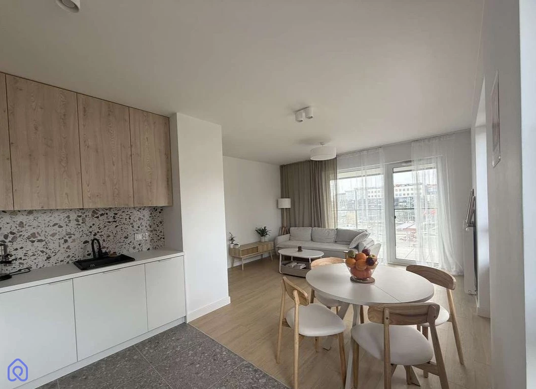 Nowoczesne wykończenie (jasne drewno, gres, designerskie oświetlenie).
