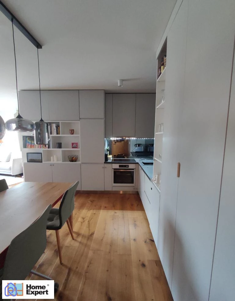 - Nowoczesny aneks kuchenny wykonany na wymiar, w pełni wyposażony w sprzęt AGD