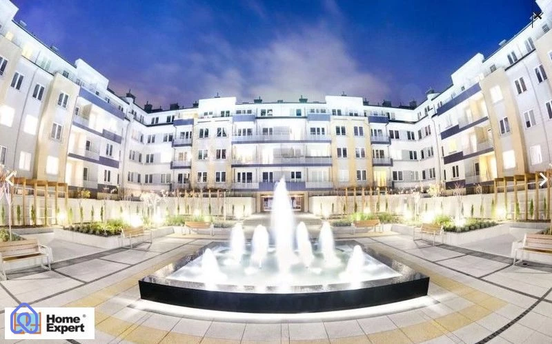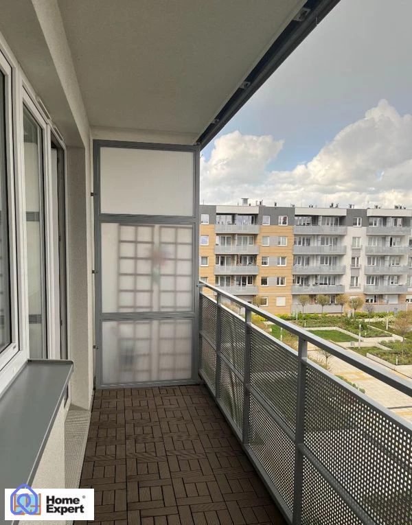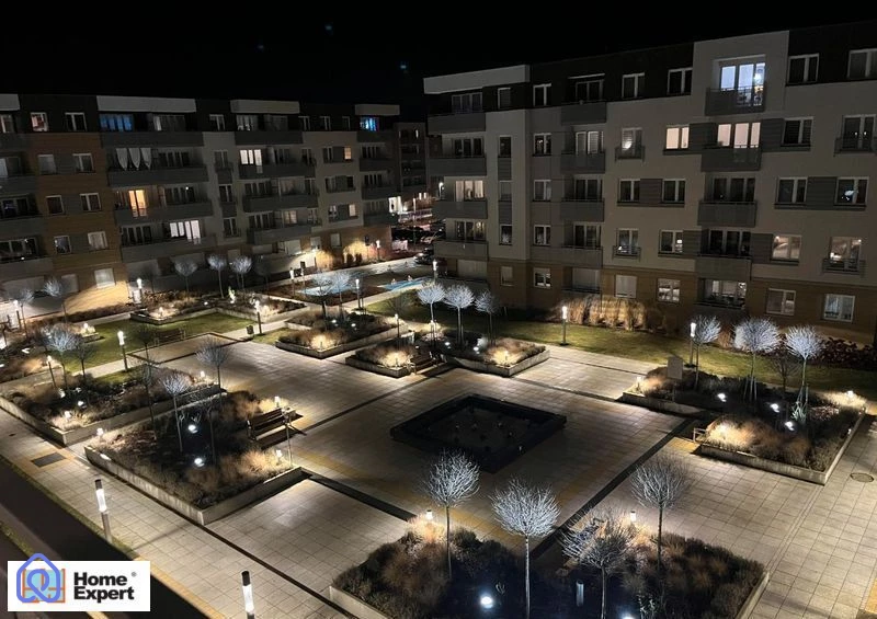 Mieszkanie jest dwustronne, balkony znajdują się od strony wschodniej (widok na patio z fontanną) i zachodniej (widok na plac zabaw).