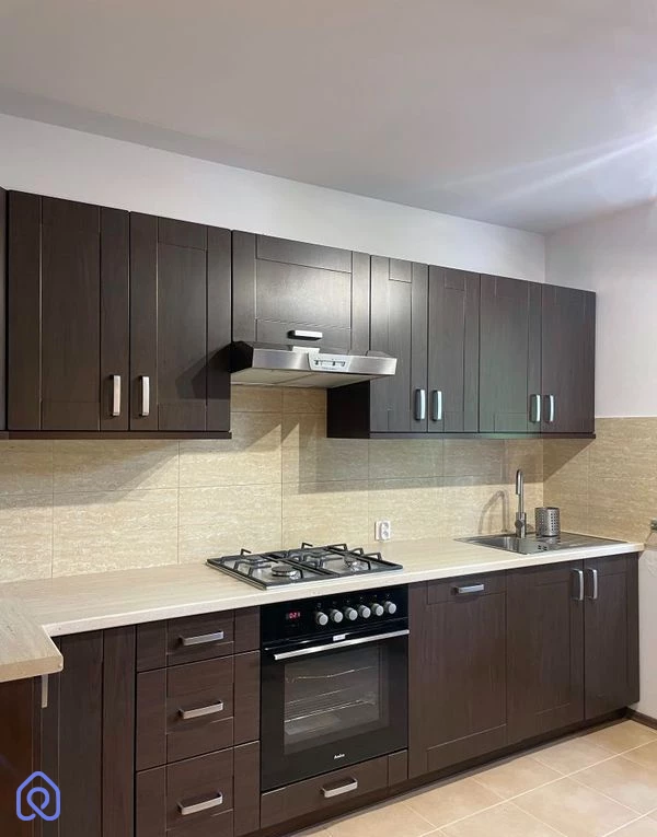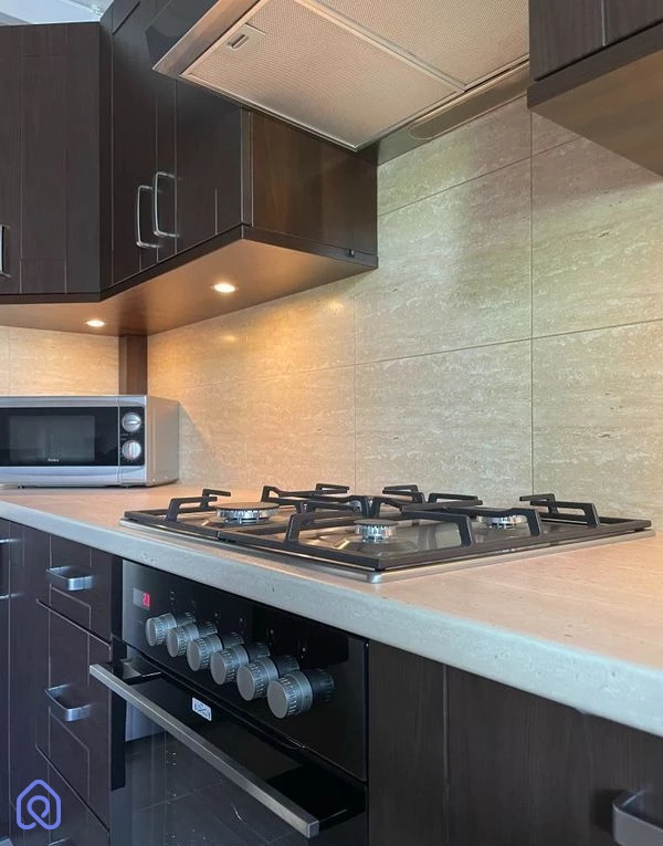 Kuchnia wyposażona w kuchnię gazową, piekarnik, lodówkę oraz zmywarkę.