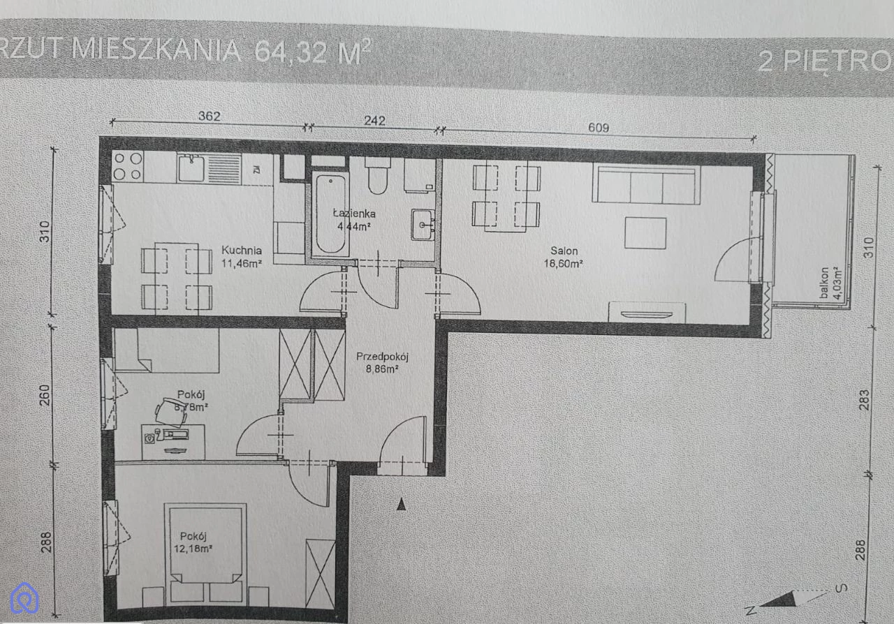 Przestronne, w pełni rozkładowe, 3-pokojowe mieszkanie z balkonem i oddzielną kuchnią. Łączna powierzchnia to 64,5 m2, lokal jest dwustronny i usytuowany na drugim piętrze, ekspozycja północno-południowa.