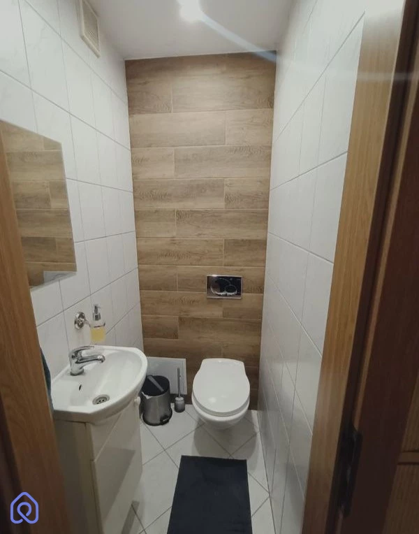 Oddzielna łazienka zachwyca praktycznością, a kabina prysznicowa z deszczownicą, szeroka umywalka i funkcjonalna szafka dodają uroku temu pomieszczeniu. Pralka i półki na ręczniki znajdują się w dużej szafie, co sprawia, że łazienka jest zarówno piękna, jak i praktyczna.