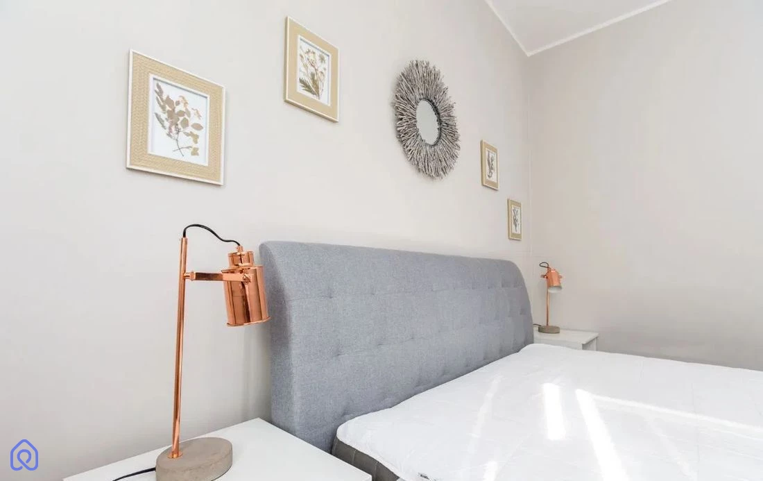 Sypialni (17,12 m²) – przestronne łóżko małżeńskie, komoda i szafki nocne.
