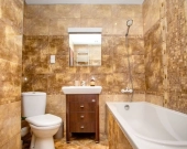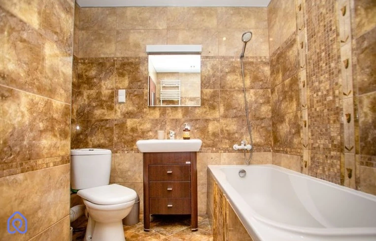 Łazienka wyposażona jest w wannę, WC, umywalkę z szafką oraz lustro.