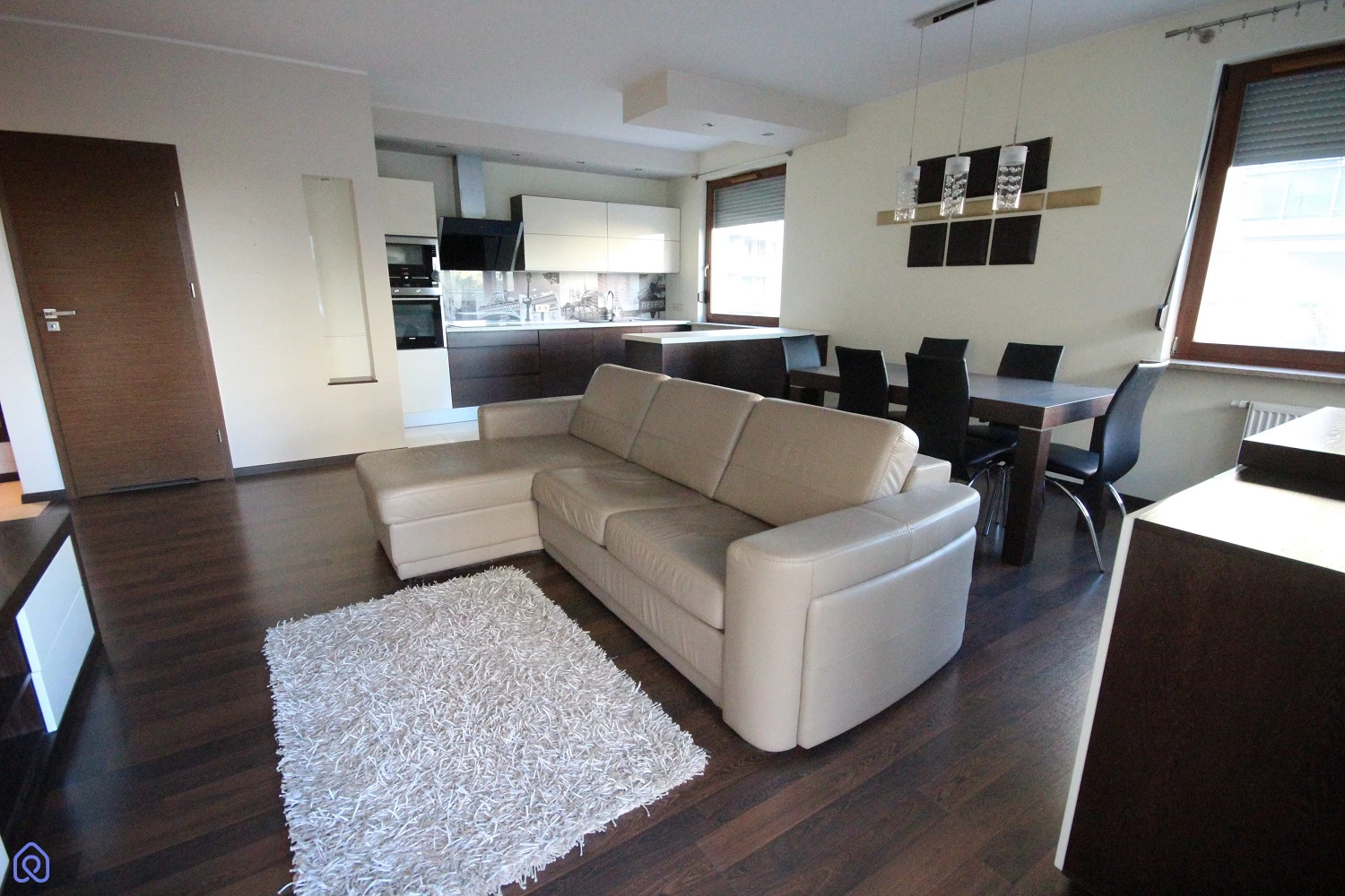 Mieszkanie przeznaczone do sprzedaży z całkowitym wyposażeniem jak na umieszczonych zdjęciach (meble z forniru i lakieru, w łazience kamień naturalny, wypoczynki oraz krzesła ze skóry naturalnej).