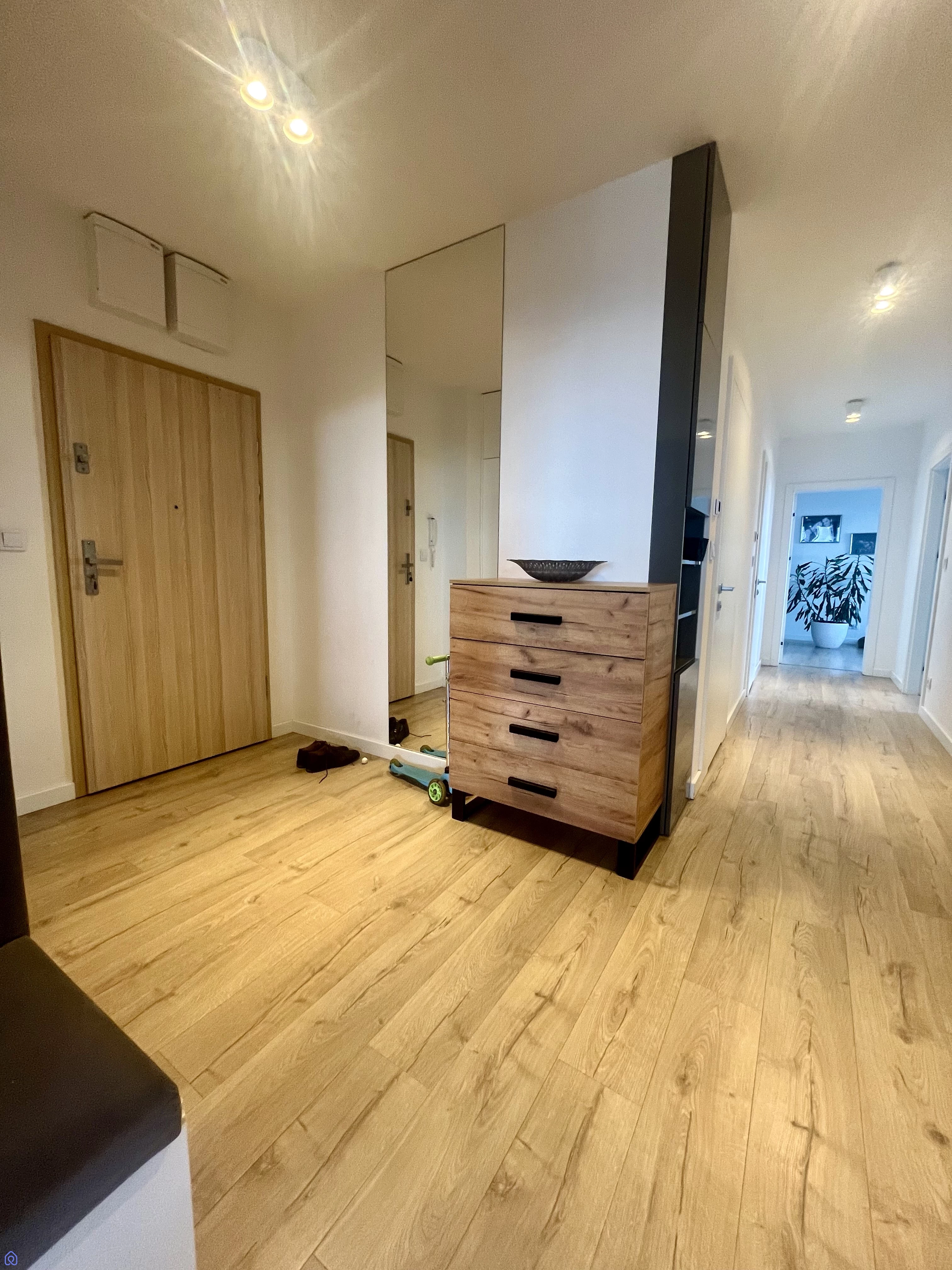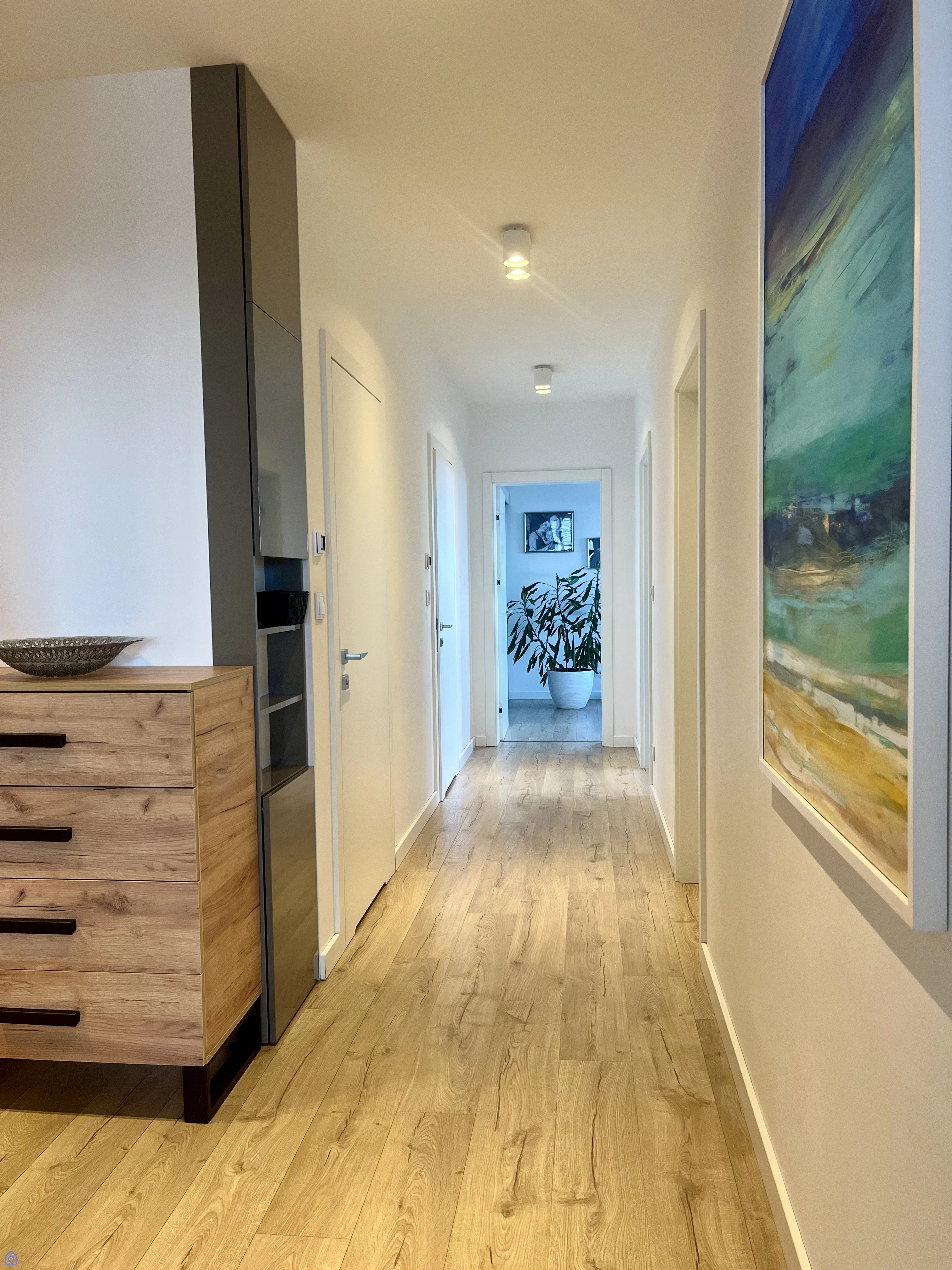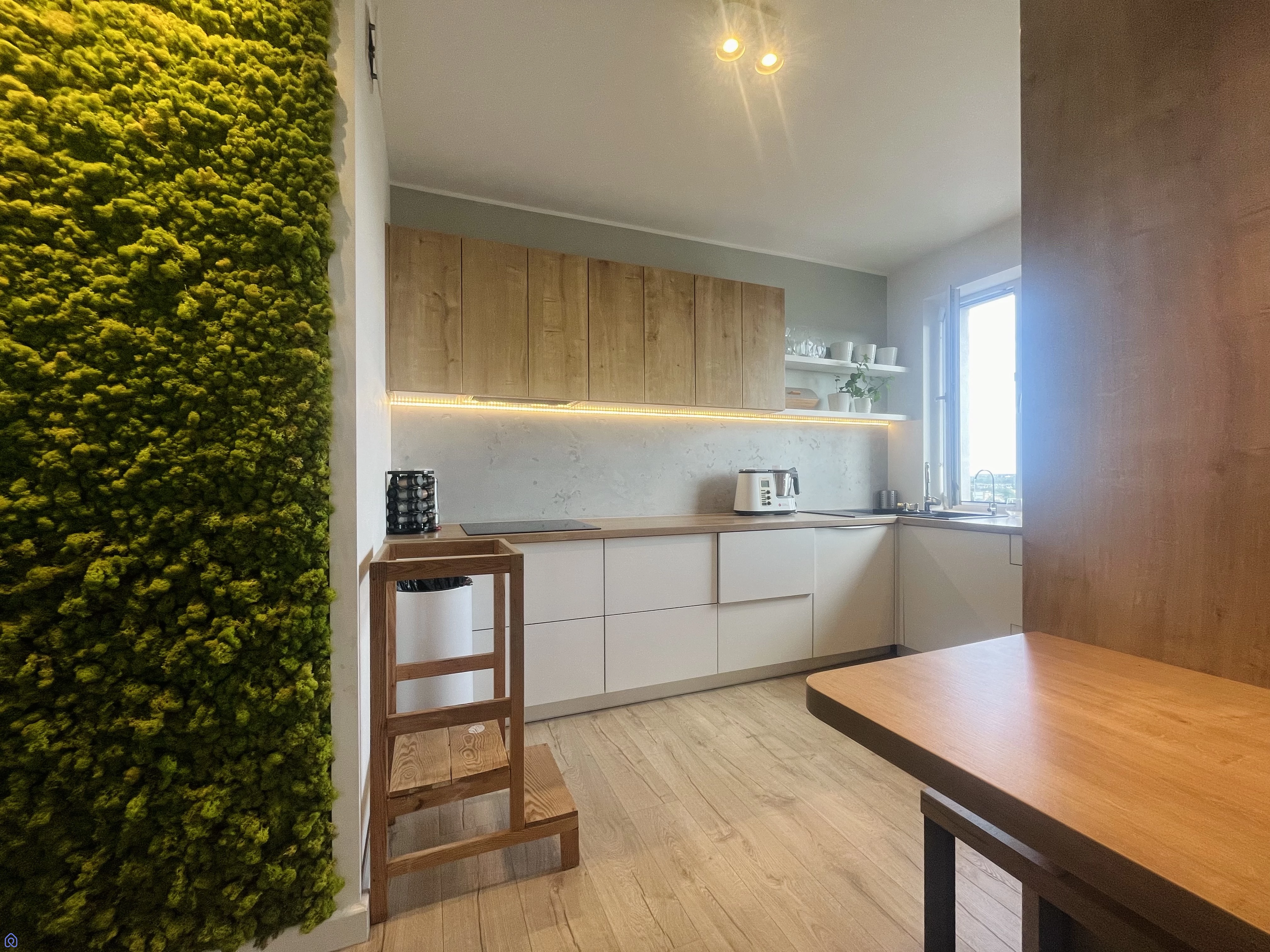 Wyjątkowy Standard Wykończenia: Apartament został starannie wykończony pod okiem projektanta wnętrz, z dbałością o każdy detal. Ściany w salonie, kuchni i sypialni zdobi dekoracyjny trzywarstwowy tynk, a wyjątkową atmosferę tworzy ściana z mchu, która nie tylko nie wymaga pielęgnacji, ale również kojąco wpływa na zmysły przez cały rok.