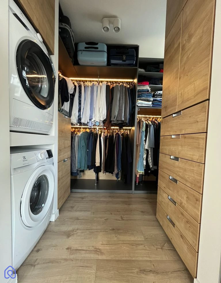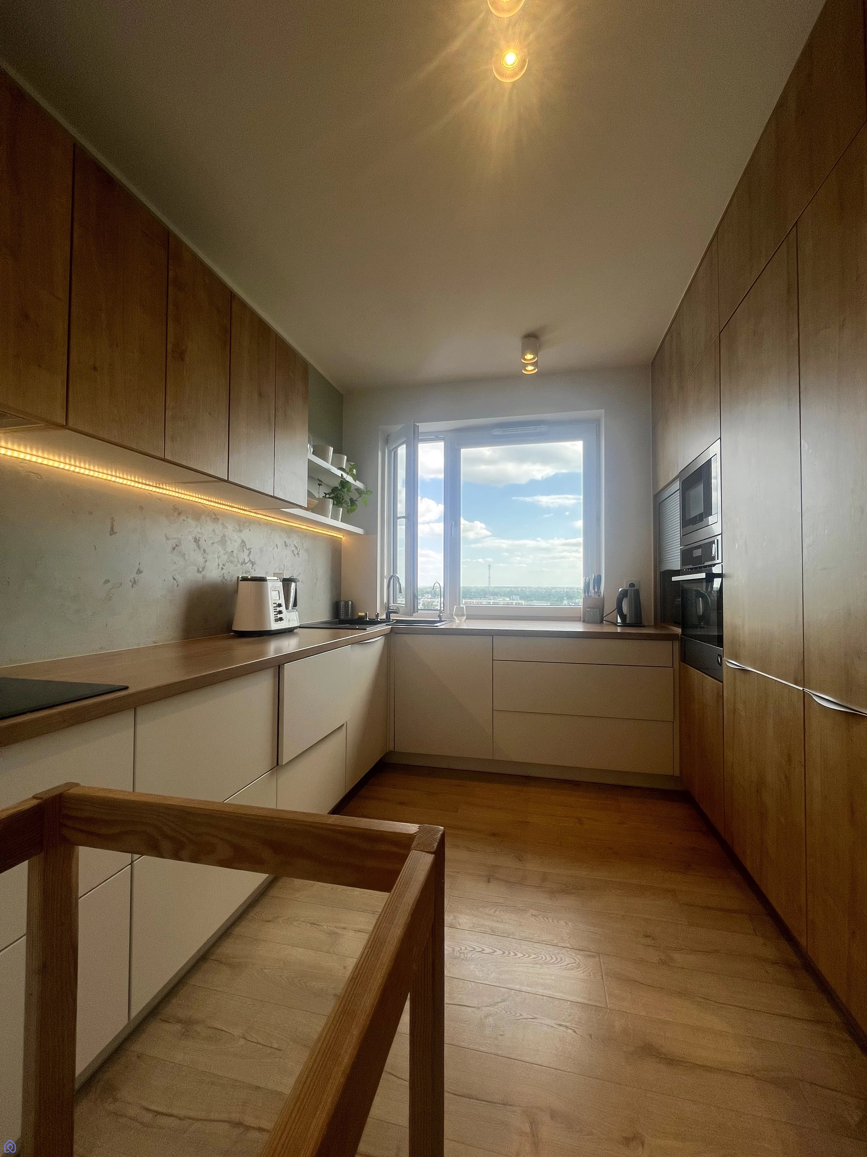 Kuchnia wyposażona jest w meble na wymiar oraz najwyższej jakości sprzęty AGD, w tym: lodówkę, piekarnik, mikrofalówkę, kuchenkę indukcyjną, wysuwany okap oraz innowacyjne, automatycznie wysuwane na dotyk szuflady. Praktyczna roleta dyskretnie ukrywa podręczne urządzenia takie jak toster czy ekspres do kawy.