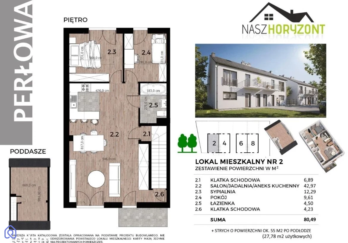 - powierzchnia mieszkań (69 m2 na parterze oraz aż 108 m2 na piętrze - 80 m2 na piętrze + balkon + 28 m2 strych na piętrze)