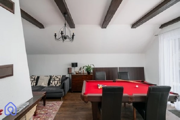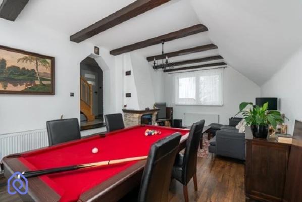 Dom posiada dwa przestronne strychy oraz piwnicę z dwoma pomieszczeniami, kotłownią oraz garażem. Dodatkowo na zewnątrz znajduje się podwójny garaż blaszany.