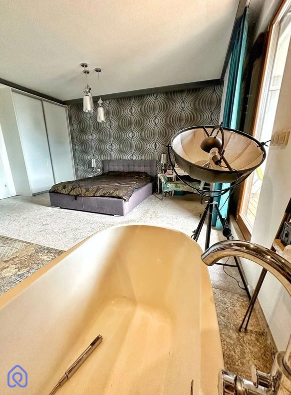 Dodatkowo, sypialnia główna posiada własny pokój kąpielowy i taras, a także przylegającą garderobę.