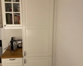 W kuchni wysokiej klasy sprzęt AGD: lodówka z zamrażarka, pralko-suszarka, piekarnik elektryczny oraz płyta indukcyjna.