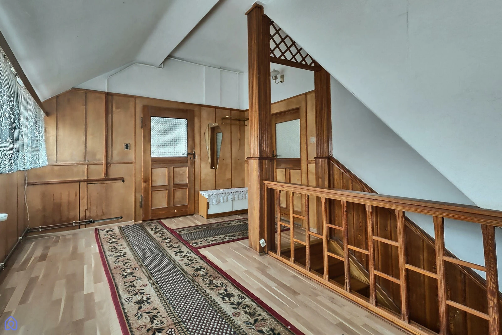 Na piętrze znajdują się korytarz dwa duże pokoje, łazienka z toaletą oraz wejście na znajdujący się na poddaszu strych. Powierzchnia piętra to 64,7 m2, natomiast powierzchnia strychu to 16,7 m2 (do powierzchni nie wlicza się miejsc, w których pomieszczenie jest niższe niż 140 cm). Powierzchnia ogólna budynku, wraz ze strychem oraz piwnicą wynosi 224 m2, natomiast powierzchnia parteru wraz z pierwszym piętrem wynosi 161,7 m2.