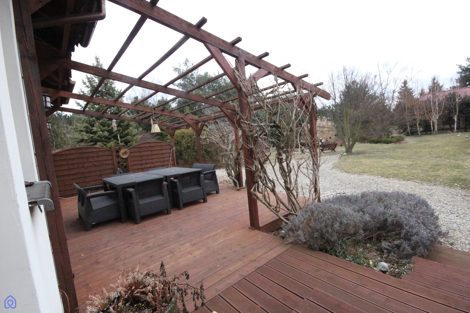 Ogród zagospodarowany i zadbany, z werandą, miejscem na ognisko/grila oraz domkiem narzędziowym.