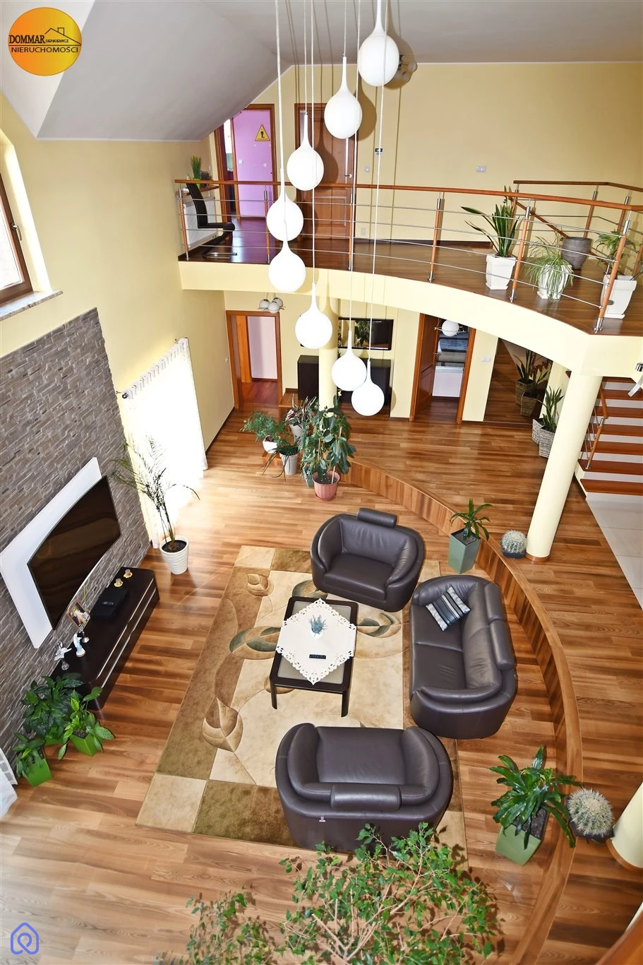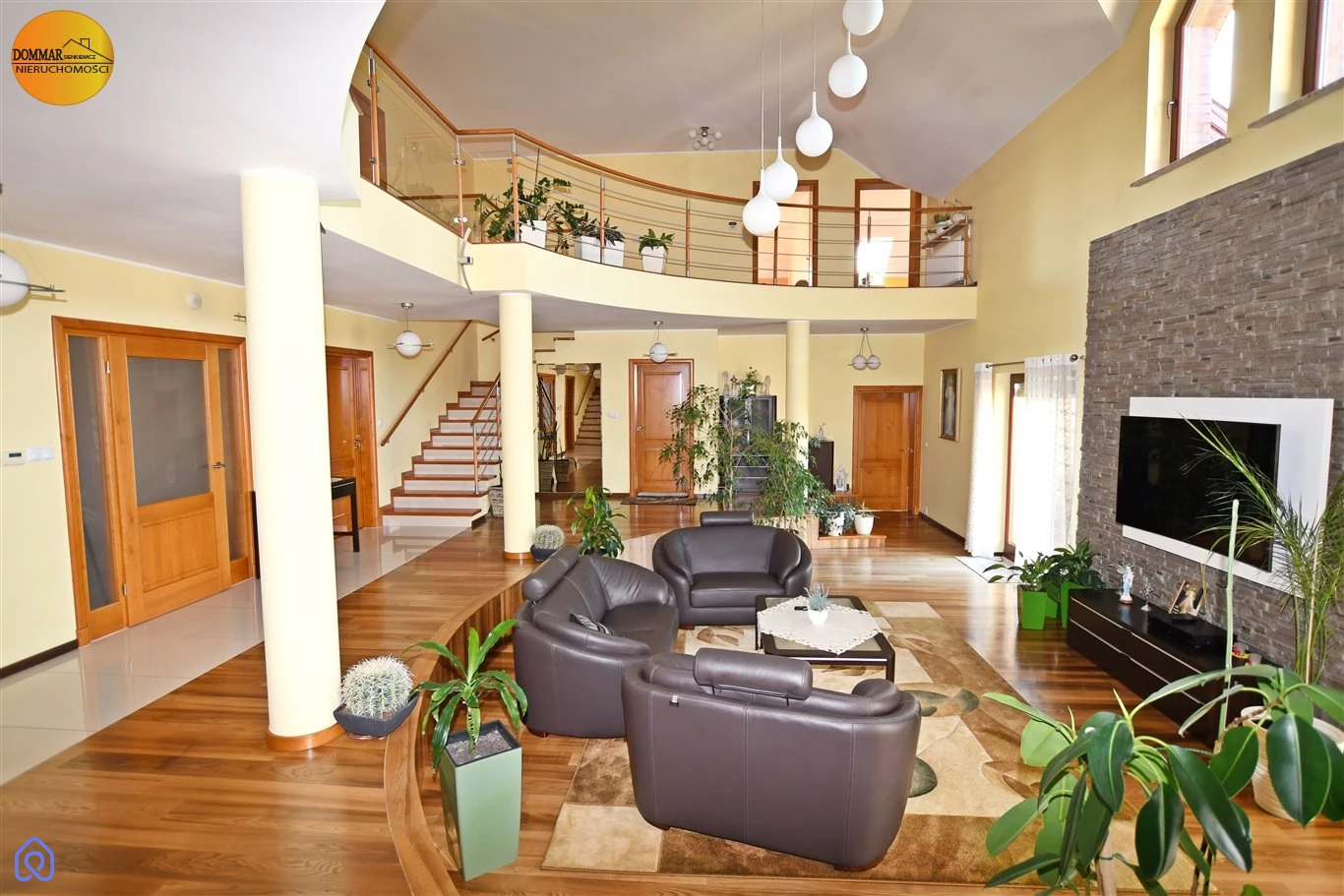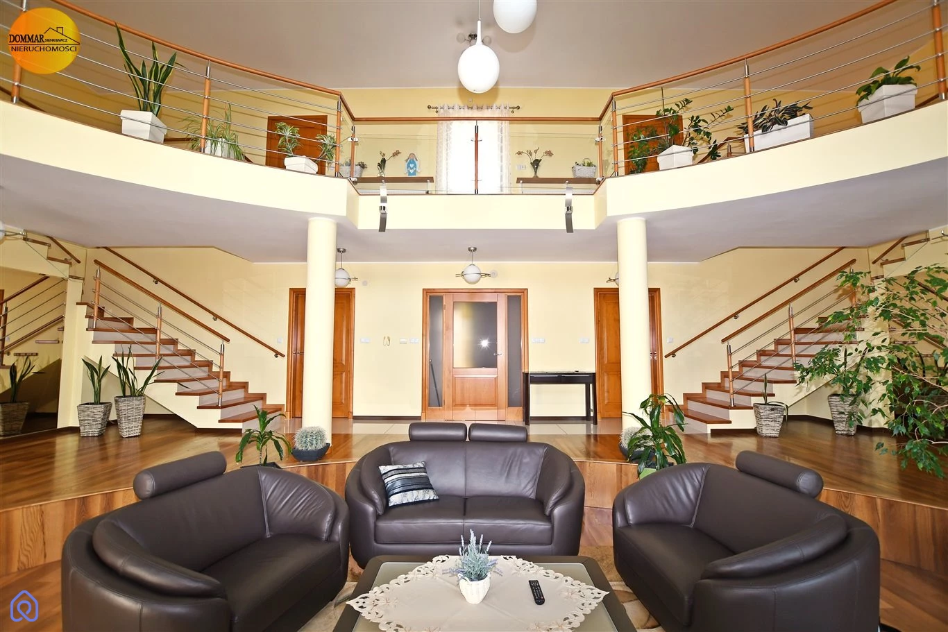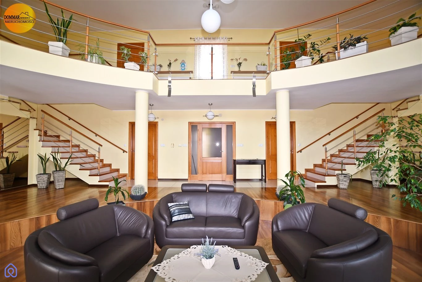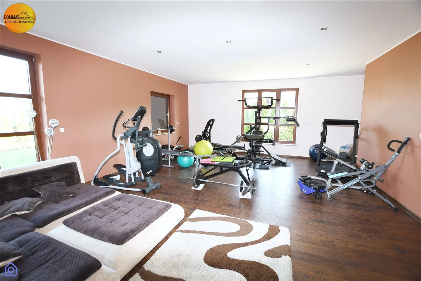 Przestronny salon z efektownym, wysokim sklepieniem – wrażenie przestrzeni potęgują panoramiczne okna z wyjściem na taras i widokiem na ogród oraz kryty basen – idealny do relaksu i spotkań towarzyskichDesignerska kuchnia z jadalnią oraz funkcjonalną spiżarniąPokój dzienny / gabinetNowoczesna łazienka z prysznicem + osobna toaletaPralnia, pomieszczenie gospodarczePomieszczenie sportowe / domowa siłowniaDwustanowiskowy garaż z bezpośrednim przejściem do domu