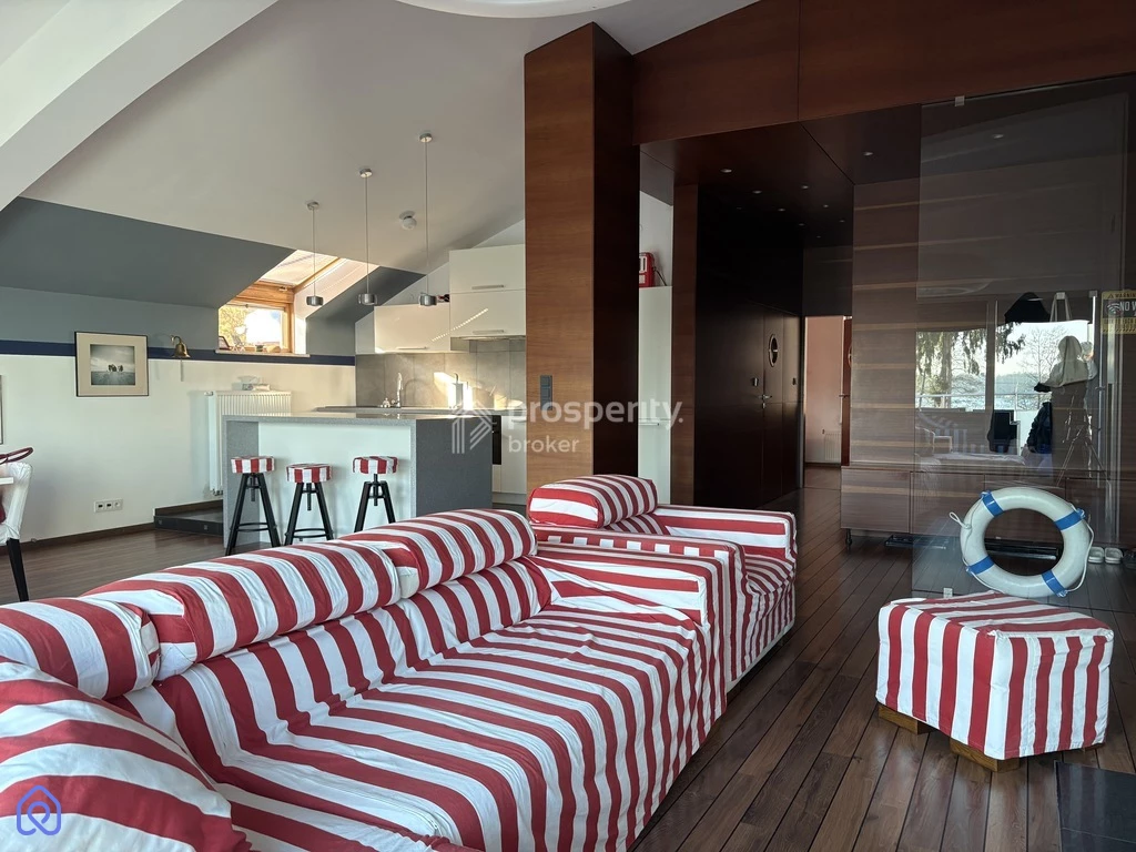 Wnętrze apartamentu zostało zaprojektowane i wykonane z niezwykłą dbałością o detale, z najwyższej jakości materiałów, w charakterze nawiązującym do stylistyki żeglarskiej. To wyjątkowa przestrzeń dla osób, które cenią nietuzinkowe rozwiązania – drzwi zdobią okrągłe bulaje, podłogi przypominają drewniane pokłady, a wykończenia ścian z fornirów egzotycznych nawiązuje do naturalnych materiałów używanych w budowie jachtów. Dzięki temu całość tworzy niepowtarzalny klimat luksusowej kajuty na statku, co doskonale współgra z bliskością wody i widokiem na Narew. Wnętrza powstały z pasji do żeglarstwa i zachwycą każdego, kto szuka miejsca z duszą i oryginalnym charakterem.