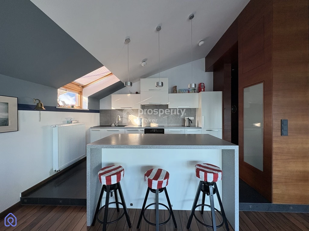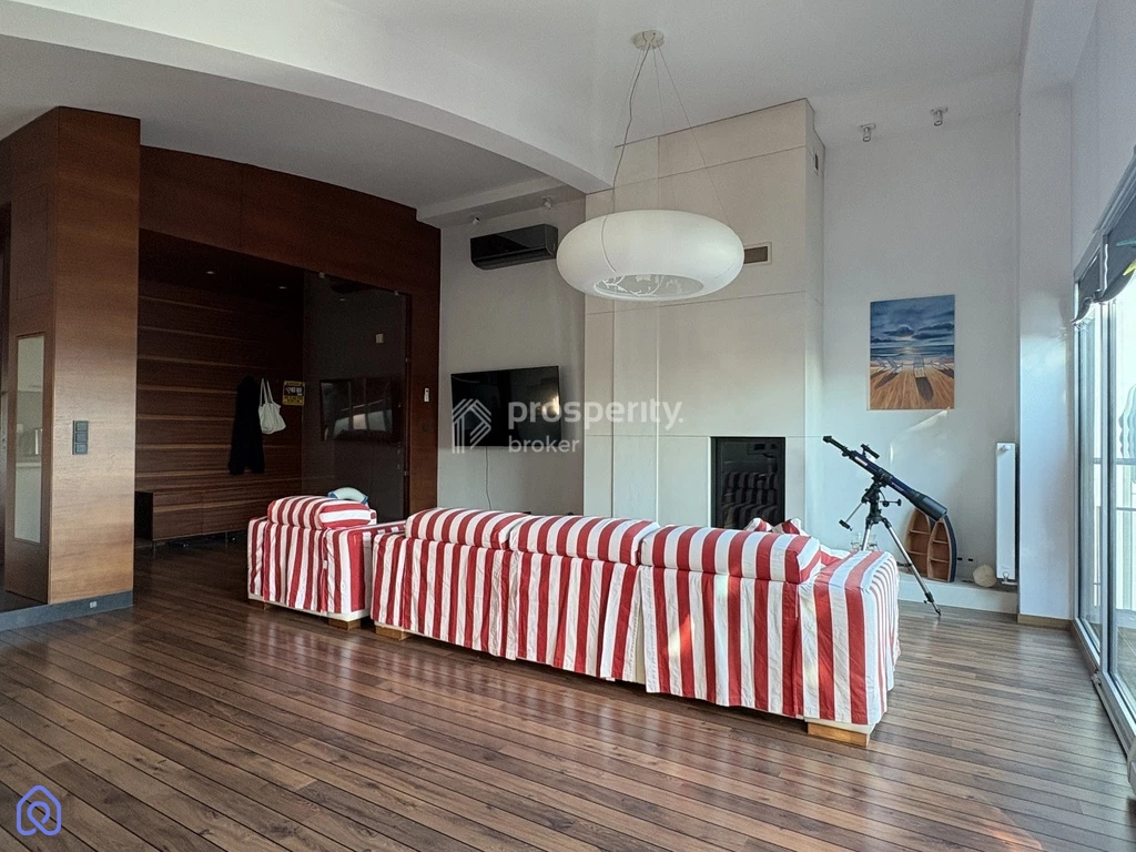 Salon ma ponadstandardową wysokość i nietypowe sklepienie, co dodatkowo nadaje mu wyjątkowego charakteru. Apartament wyposażony jest również w klimatyzację.