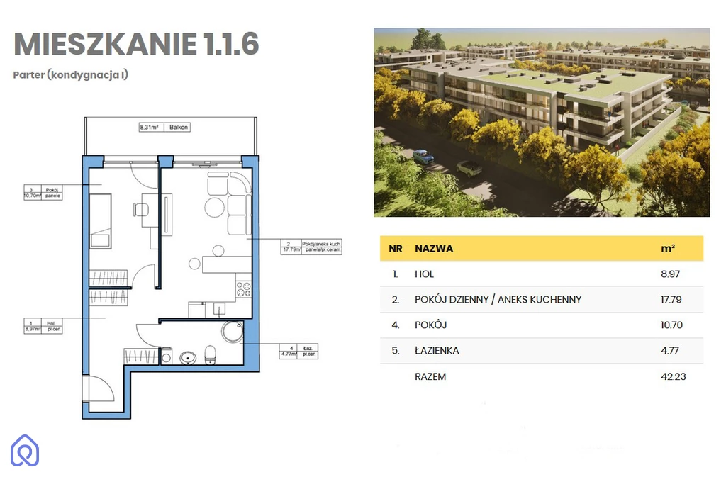 Osiedle składa się z pięciu budynków o niskiej zabudowie, które razem tworzą elegancką, spójną przestrzeń. Łącznie dostępnych jest kilkanaście mieszkań o powierzchniach od 37 do 66 m², z różnorodnymi układami – od przytulnych dwupokojowych po przestronne, rodzinne apartamenty z trzema lub czterema sypialniami.