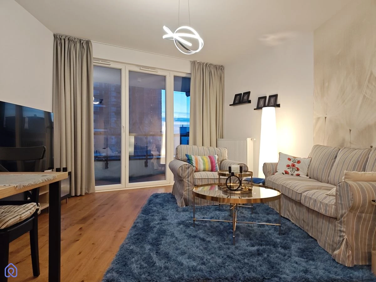Układ mieszkania: sypialnia, łazienka oraz salon z aneksem kuchennym. Dodatkową przestrzeń zapewnia duża, otwarta loggia, idealna do odpoczynku. Wnętrze jest urządzone w jasnym, nowoczesnym standardzie.