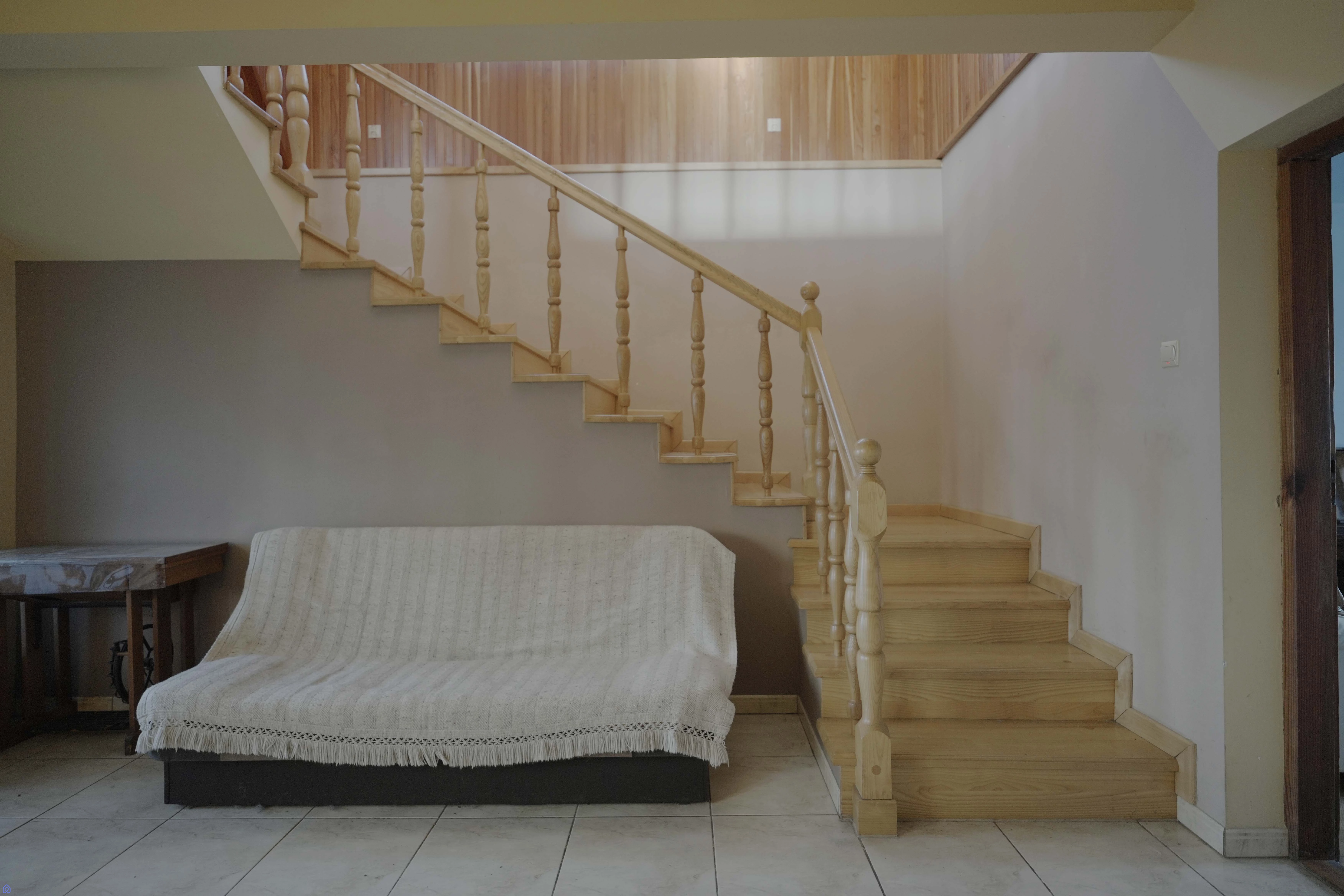 salon/ hol z drewnianymi schodami na wylewce betonowej. Oprócz tego
