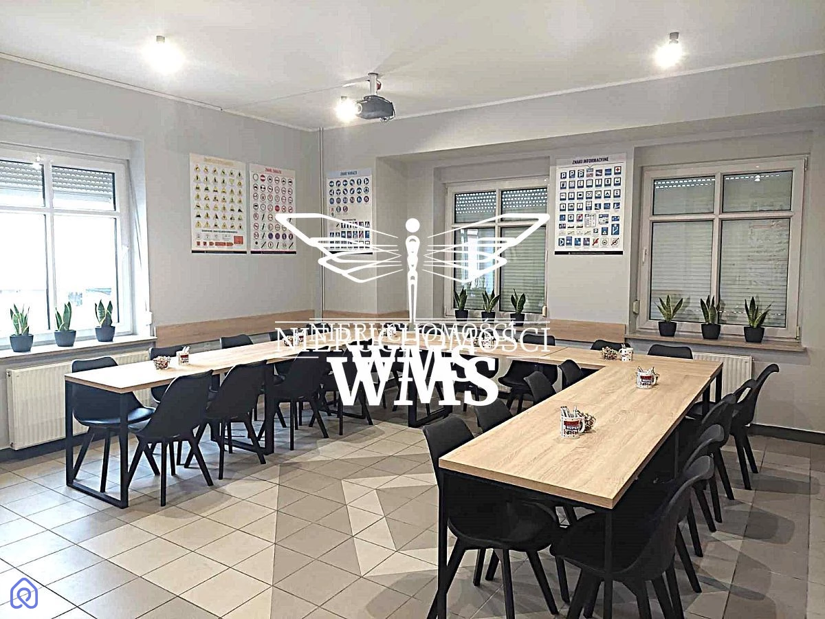 Na pierwszym piętrze znajduje się kolejny lokal, z dużą salą wykładową. Składa się on z dwóch obszernych, doskonale nasłonecznionych pomieszczeń, części kuchennej oraz toalety zlokalizowanej na półpiętrze.