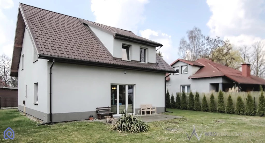 Dom wolnostojący, nieduża działka z częściowymi nasadzeniami i trawnikiem.