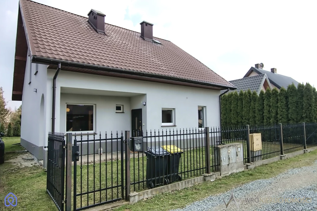 Dom wolnostojący, nieduża działka z częściowymi nasadzeniami i trawnikiem.